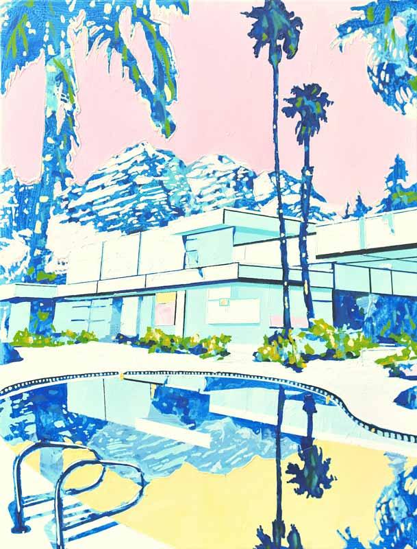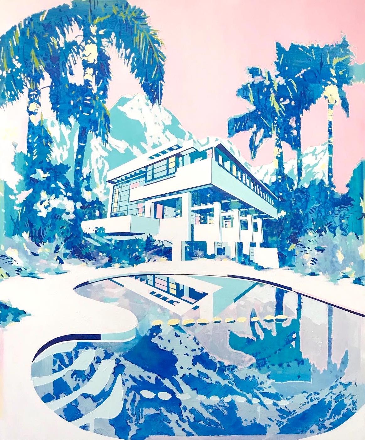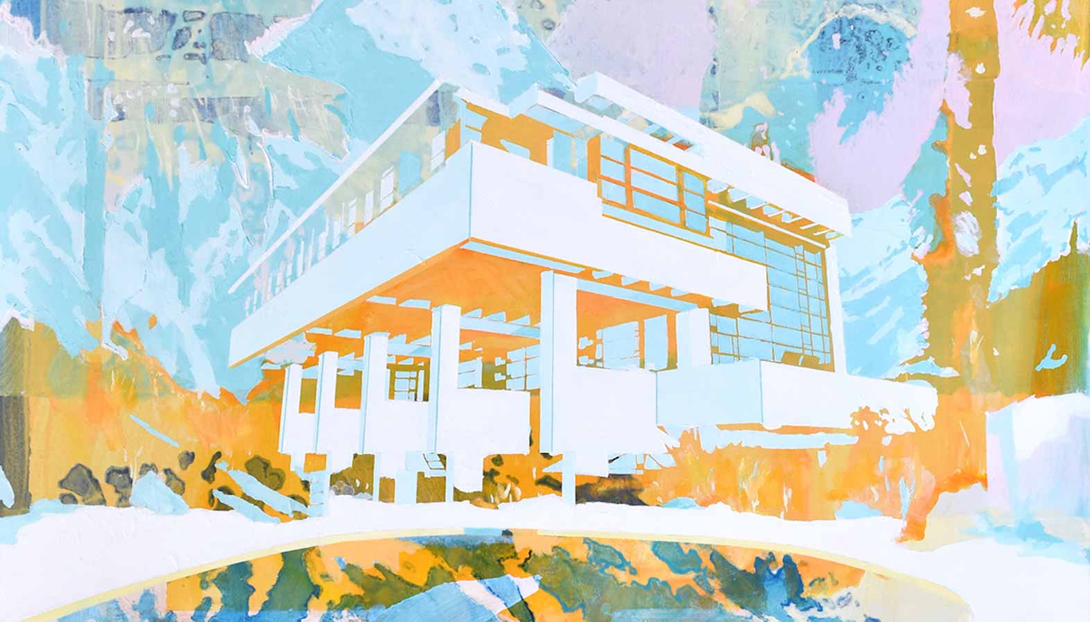 His latest is a collaboration with Australian artist Paul Davies. In it, Davies paints one of his signature acrylic portraits of a mid-century modern house surrounded by tall palms, an image derived from stencils cut from his photos. The soundtrack features a loop of Led Zeppelin drummer John Bonham playing a solo and a voice saying, “Man, I ain’t believin’ that shit about Bonham’s one-hour drum solos, man. I mean one hour of drums, you couldn’t handle that shit on strong acid, man.”