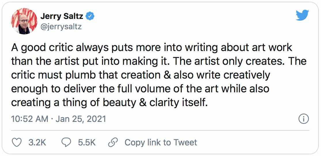 New York art critic and Pulitzer Prize winner Jerry Saltz (1951-) fell in hot water in January after declaring his superior talents via tweet while disparaging the work of artists that provide a reason for his own existence. No stranger to controversy, Saltz tweeted a mea culpa a few days later, but the damage was done and the blowback from colleagues and artists alike was swift. Whether this momentary lapse of judgement does permanent damage to Saltz’s already dicey reputation remains to be seen.