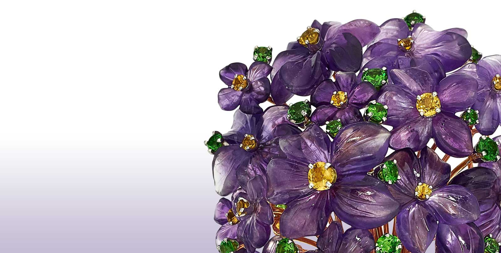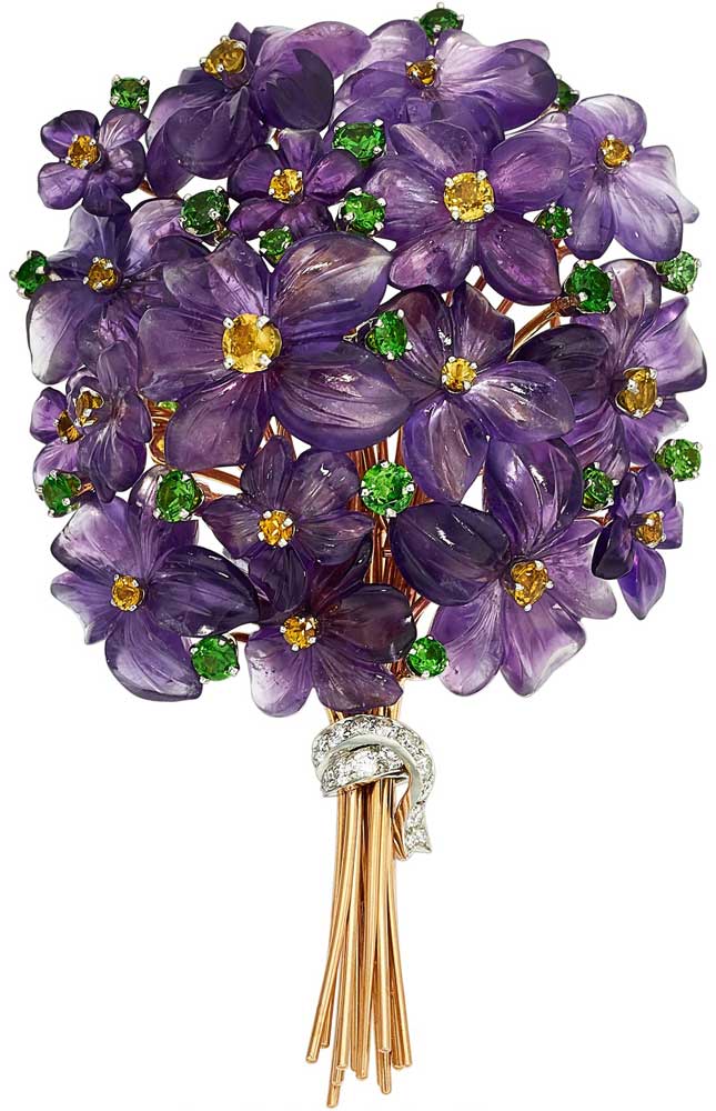 Most flowers are ephemeral, but the violet blossoms in this brooch by Carvin French still look fresh and appealing, many years after they were beautifully set in place. Modeled after a live bunch of violets, one of the many delights of this brooch is the use of demantoid (green) garnets and yellow sapphires, sprinkled within the amethysts, emulating the real flowers. Green garnets, weighing a total of 3.51 carats, and the 2.01 carats of yellow sapphires, bring brightness to the quiet purple of the carved amethysts. The artfully shaped amethysts capture the look of violets to a remarkable degree.