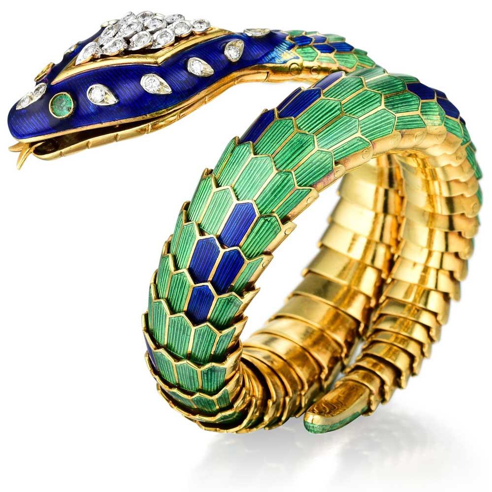 Each scale was fitted into overlapping rows, with alternating sections of blue enamel nestling within the majority green body of the piece. Each section is striated, to simulate the skin of a snake. The rows are then fitted together in circular sections and hinged to allow them to flex, while staying firmly attached. The bracelet expands from an inner circumference of five inches to approximately 6 ½ inches. The head of the snake, all blue enamel, is accented by 23 round diamonds, weighing about 0.55 carat total, along with two round emeralds for the eyes. A tiny gold tongue pokes out from the front of the head. This is a tour-de-force of jewelry making.