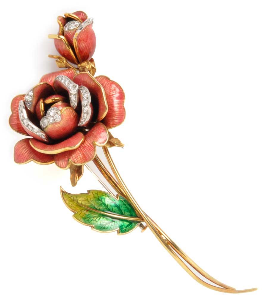 The soft petals of a pink rose were captured in naturalistic detail in a gold, enamel and diamond brooch made by German jeweler René Kern. The piece, measuring 4 ½ inches in length, depicts a fully opened blossom, with a smaller bud that is about to open. The enamel petals are edged in full cut and single-cut diamonds as is the innermost part of the main flower. The diamonds suggest dew drops on the petals and nestle within gold settings. One enamel leaf, artfully merging yellow and green tones along the 18k gold stem, gives even more life to the piece. Working enamel on rounded surfaces is the ultimate achievement of this demanding technique. Here, colors are muted and shaded for the ultimate realism. Each petal was modeled individually, and then affixed to the blossoms. The fully opened flower as well as the bud rest delicately, but firmly, on the 18k gold stems. The piece was hallmarked and signed, and offered in a fitted box.