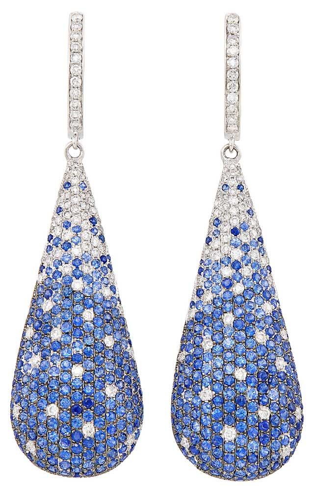 Working in the round is a challenge both for the jeweler and the gemsetter, as is exemplified by this pair of sapphire and diamond pendant earrings. The drops are fashioned from myriad small round diamonds, weighing a total of 1.75 carats, and numerous round sapphires, in varied tones of blue, weighing a total of 5.25 carats. The earrings are so beautifully proportioned, the drops have a liquid feel to them. White diamonds are sprinkled amongst the sapphires, adding brightness and glitter to the more muted blues. The ombre or shaded tones of the sapphires enable the jeweler to create a subtle visual effect, somewhat like the waves of the ocean.