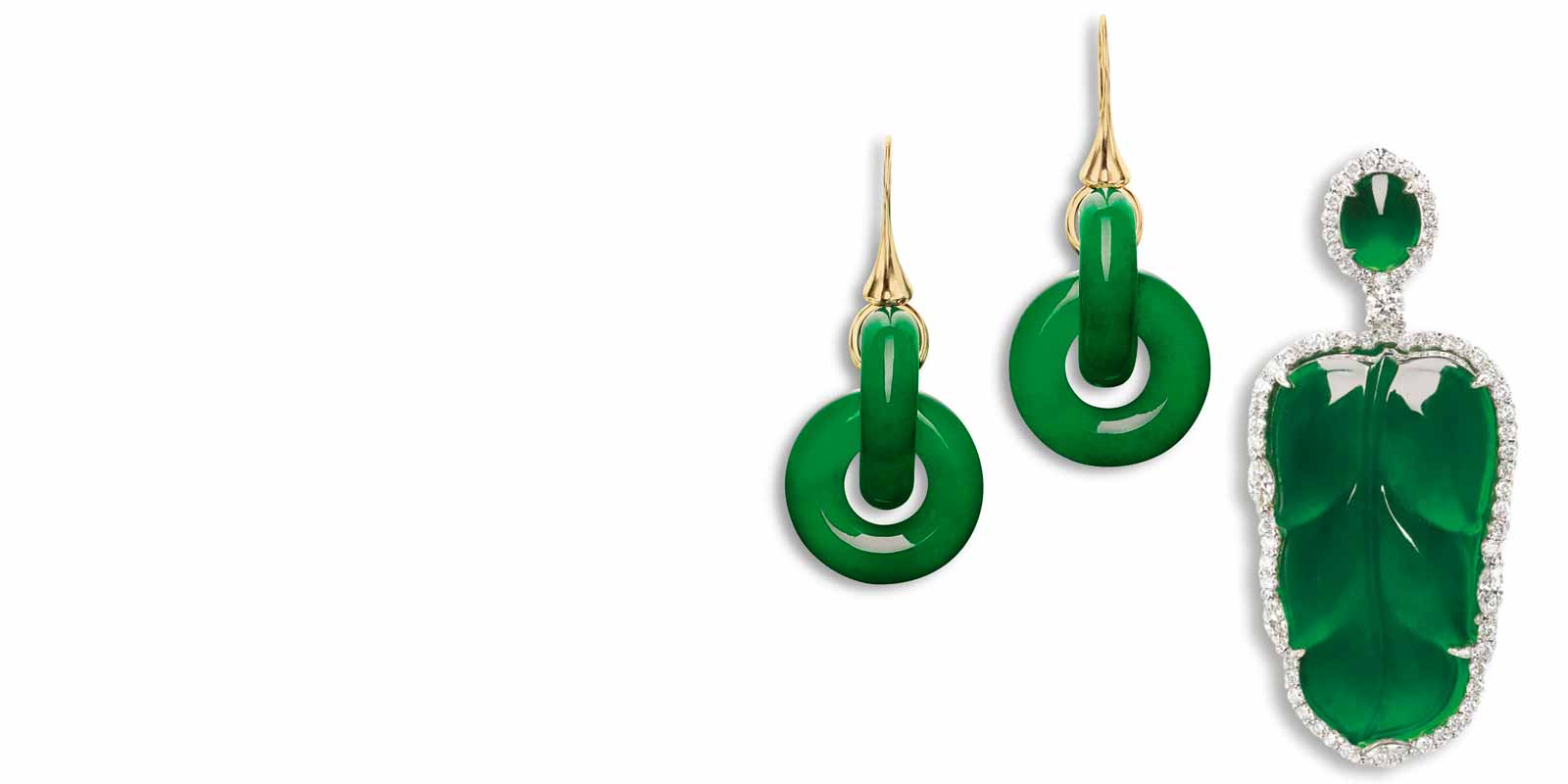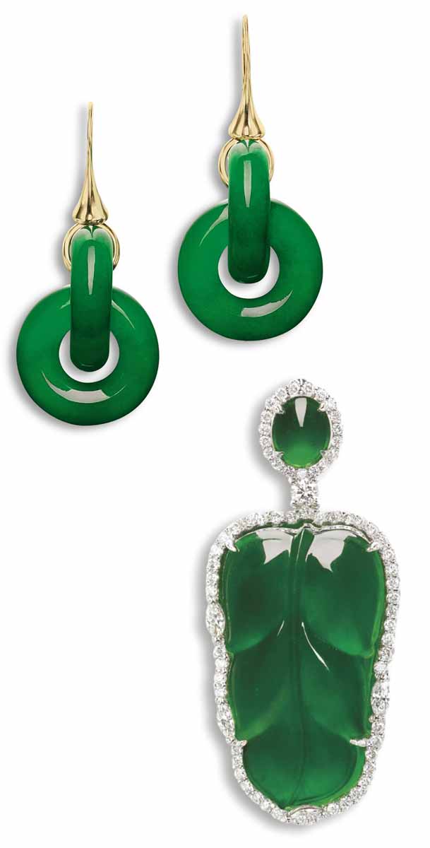 Compare these two fine jadeite lots from a recent sale in Hong Kong. The pair of simple double-loop jadeite earrings offers the essence of this green gemstone. Jadeite has an appeal in the Asian market, especially to Chinese customers, whose culture has a deep connection with the stone and appreciation of its subtle qualities. Jadeite, like diamonds and sapphires, occurs in a wide range of colors depending on the minerals present when it is formed. Apple green jade with the rich translucence seen here ranks highest in appreciation and consequently in price. This pair of earrings is remarkable for the intensity of the color and the translucency, clearly on display in the smoothly polished surface. There are no carvings or facets to hide any flaws. You are looking into the very heart of the mineral.