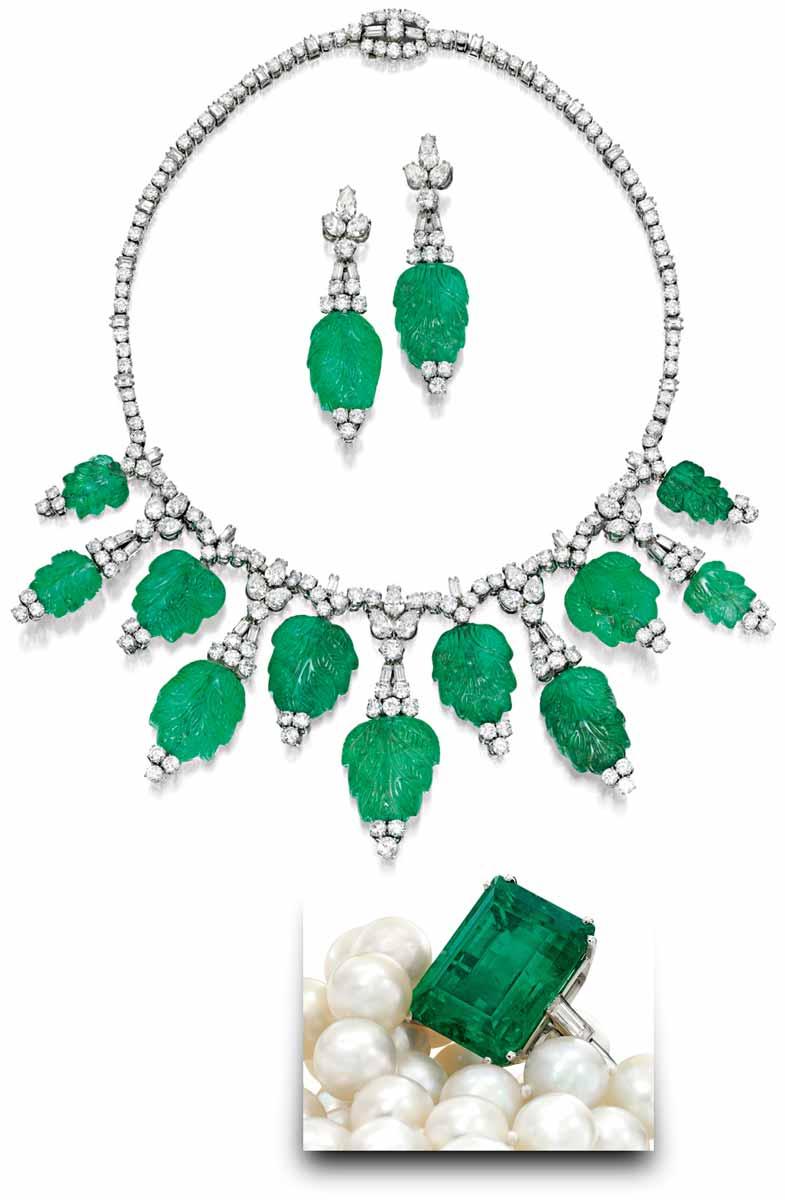 Compare this single stone ring to the emerald and diamond necklace and matching earrings, by Bulgari, circa 1960. Like the jadeite pendant seen above, these emeralds were all carved into leaf shapes, effectively disguising inclusions and lack of transparency while displaying the desirable emerald color. Each of the 11 leaves on the necklace as well as the two leaves created as pendant earrings are suspended from settings of round, baguette and pear-shaped diamonds. A matching diamond necklace sets off the leaf drops.
