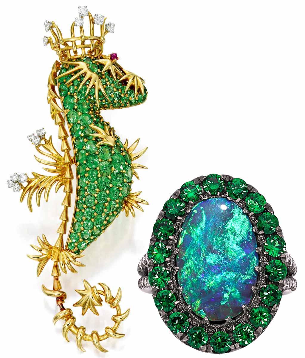 Moving out of the “precious” category, but no less compelling, are two lots set with tsavorite garnets.