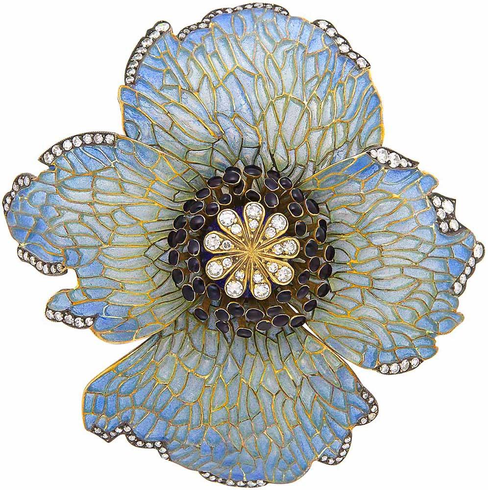Plique-à-jour is rarely seen in contemporary jewelry and requires extraordinary skills in making. While the enamel is supported by a backing material during the process of creation, once the piece is fired in a kiln, the backing is removed. The enamel panes or panels are then exposed to the light. Enamel is made from a form of powdered glass and is intrinsically strong, like glass, but also subject to breakage. This piece shows complete command of the technique along with great artistry in conveying a flower in full bloom.