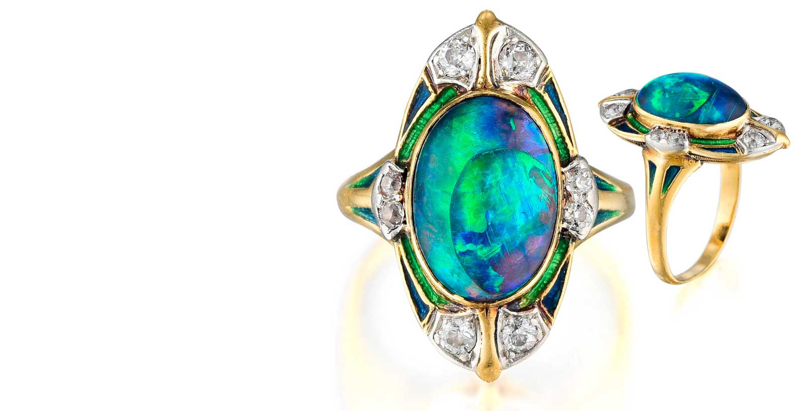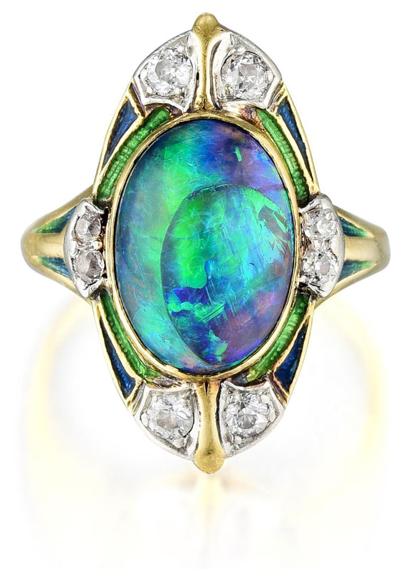 The impeccable provenance of this opal and diamond ring is just one of its many attributes. Designed by Louis Comfort Tiffany around the turn of the last century, the elegant ring features a fine black opal weighing approximately 2.20 carats. Echoes of the dominant blues and greens of the opal are found in the delicate enamel work that forms part of the 18k gold frame. The ring is further enhanced by eight old European diamonds. Though their total weight is just 0.40 carat, they offer the perfect complement to the rich tones of the opal. The ring is signed “Tiffany & Co.”, and is stamped 18k with a maker’s mark and an identifying number.
