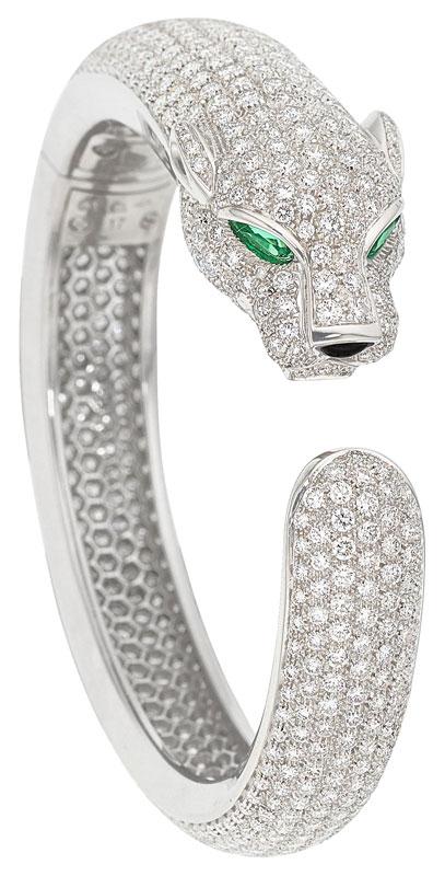 From the tip of its black onyx nose to its emerald green eyes, this panther exudes fierceness. The remarkable bracelet by Cartier France depicts its classic panther design formed entirely in diamonds set in white gold. The diamonds are pavé set, creating an overall carpet of brilliance. The myriad diamonds weigh a total of 15.74 carats. The emeralds are faceted and cut into elongated pear shapes to emulate the piercing gaze of a real wildcat. The shape of the face is outlined with white gold, further demarcating the feline grace of the beast. This bangle features a remarkable hinge that permits the head to swivel, allowing the bracelet to be slipped on and then secured on the wrist. It is ironic that in nature, a panther appears to be all black but upon close inspection, one can see the dotted pattern on its skin.
