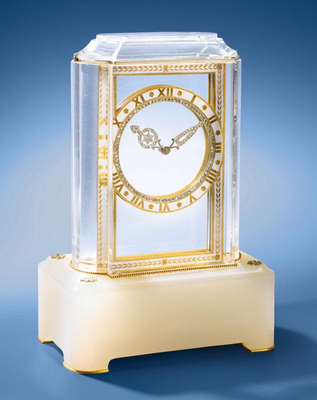 A rare, exquisite mystery clock by Cartier, circa 1930s made a spectacular appearance at Sotheby’s Paris jewelry sale, and earned $591,905. Superlatives cannot capture the unique beauty and technical wizardry that went into the making of this clock, one of only eighty made by Cartier since the first model appeared in 1912. Dubbed the “Model A” by Cartier, the clock is made up entirely of gemstone materials, starting with the white chalcedony base, outlined with gold trim. The entire clock is carved from transparent rock crystal. The hands are set with diamonds and point toward a white enamel bezel depicting the Roman numerals of the clock dial. The mystery, of course, relates to the apparent absence of any way for the hands to move around the face as time ticks by. Even knowing the secret of how these clocks work does not detract from their elegant and other-worldly appearance. Spoiler alert: The rock crystal is cut in half and then hollowed out to make space for the clock face and hands. The hands are attached to transparent circles that move within the bezel, which is itself connected to enamel and gold columns. The columns connect to the chalcedony base where the mechanism is tucked away, out of sight.