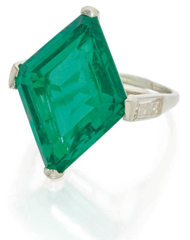 The deeply saturated emerald was singularly clear and clean, qualities rarely found in even the finest emeralds. The lack of inclusions, known as jardins, or silk, in the jargon of the gemstone trade, generally indicate a certain amount of acceptable internal flaws but this stone had virtually none. According to Kendall Reed, Sotheby’s jewelry expert for this sale, “This was a clear, clean crystal. The clarity was very high, it was almost as clear as a diamond.” The richness of the color marked it as Colombian, considered the finest of emerald sources. The size was also remarkable. “Emeralds over five carats are rare,” she added, “and this one, over ten carats is extremely rare.” Because the stone was not very deep in volume, the weight was more spread out, making it appear even larger than its 10.68 carats. The lack of depth reinforces the richness of the color, which was evenly saturated throughout the stone. Interest in the emerald was quite high but in the end it came down to the usual suspects, two determined bidders, one in the room, the other on the phone.