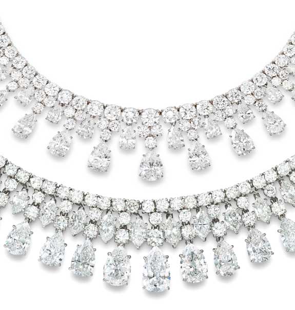 Ms. Domyan would wear this necklace nestled above lot #112, which features two rows of graduating round diamonds, suspending a fringe of pear-shaped diamond drops. The total weight of this necklace is 86.30 carats. Many of the pear shapes that comprise the lower level of the necklace would serve as impressive engagement ring center stones, with the largest diamond weighing in at 3.43 carats.
