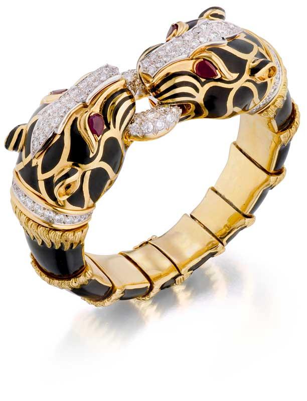 Bold design, a striking palette, and a signature style distinguish this enamel, diamond and ruby bangle by David Webb, also from the estate of Katherine Domyan. The hinged bracelet depicts two black enamel and gold jaguar heads, each set with ruby eyes and diamond pavé arrow-shaped sections running between its ears. The two heads seem to be tussling with a diamond set circle. Each also sports a diamond-set collar. David Webb’s customers are devoted to his large, dramatic designs, and usually can be counted on to bid up the lots that appear at auction with enthusiasm. This bracelet, estimated to bring $25,000-35,000, sailed over that estimate easily.