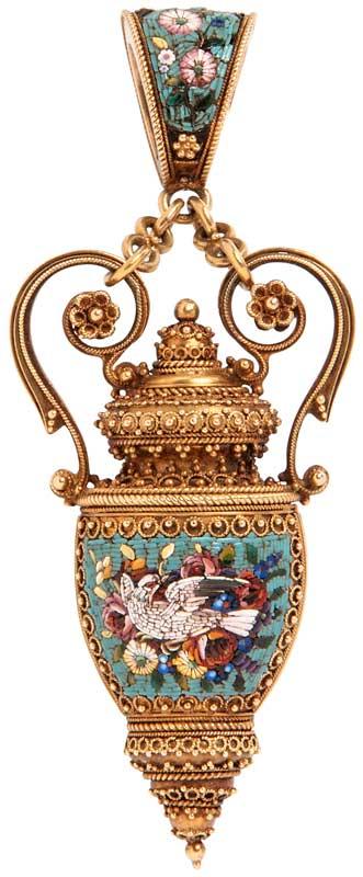 The archeological revival period in jewelry, peaking in the second half of the 19th century, took inspiration from the important finds being unearthed from ancient ruins throughout Europe. It seemed that everyone wanted to own, or wear, something that evoked the glories of the past. Jewelry embraced this notion in form and style, such as in this fine archeological revival gold and micromosaic pendant. Shaped like an urn, mimicking the real urns found at various sites, the brooch measures just three inches in height. Within that small area are various motifs including a dove and flowers, all exquisitely detailed in tiny bits of glass. Fitted together with supreme skill, the pieces form fully realized images. Only the closest inspection reveals that hundreds of pieces have been used to create the design. The mosaics are then set within elaborate gold frames, embellished with bead and rope work.