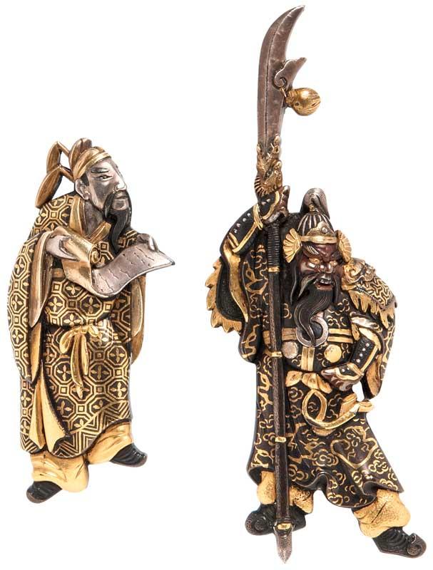 To hold these two late Edo period shakudo brooches in your hand is akin to embracing history. These two remarkable figures, measuring just 3 ¾ in by 2 /12 inches each, were sold for $3,567. One brooch carries a signature plaque for Hisanori, an historic figure from the Edo era, while the other depicts a scholar. The scholar is sumptuously outfitted in a multi-layered garment, patterned in the shakudo metalwork process, and holds a scroll, denoting his position in society. The samurai figure, with his fierce warrior’s countenance, holds a two-pointed staff. Every aspect of Japanese life during the Edo period, roughly 1615-1868, was codified. Strict social classes were established to create a sense of stability in the country which developed in strict isolation from the Western world.