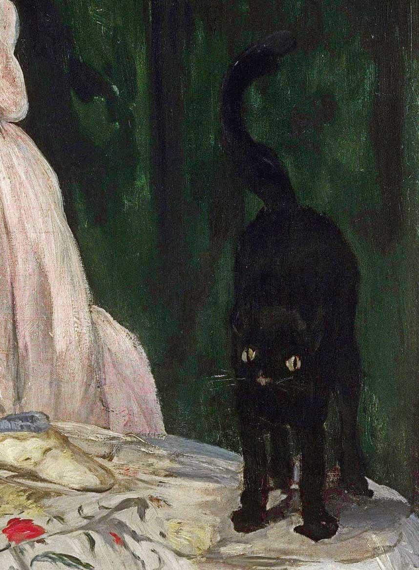 So where do we go from here? Perhaps the black cat is not only a symbol of femininity and sexuality, but he is also a projection of the artist and his ideas of modernity. Maybe the cat in Olympia acts as a vessel for the artist to communicate with his viewers. Manet regularly wrote letters to his friends lamenting about the negative feedback he received from critics. He also frequently inserted himself into the canvas, whether it be through an actual self-portrait or an object, most notably a cane. Therefore, it would make sense that Manet wished to respond to the Academie more directly through his work. Through the cat, Manet was able to cast a judgemental eye on society, to challenge the stale conventions of the Academie and society, who deemed his nude prostitute painting to be controversial, even calling it a disgusting image to be on view. But the cat gives our judgments right back to us, he is Manet’s very own “mirror of enigmas.”