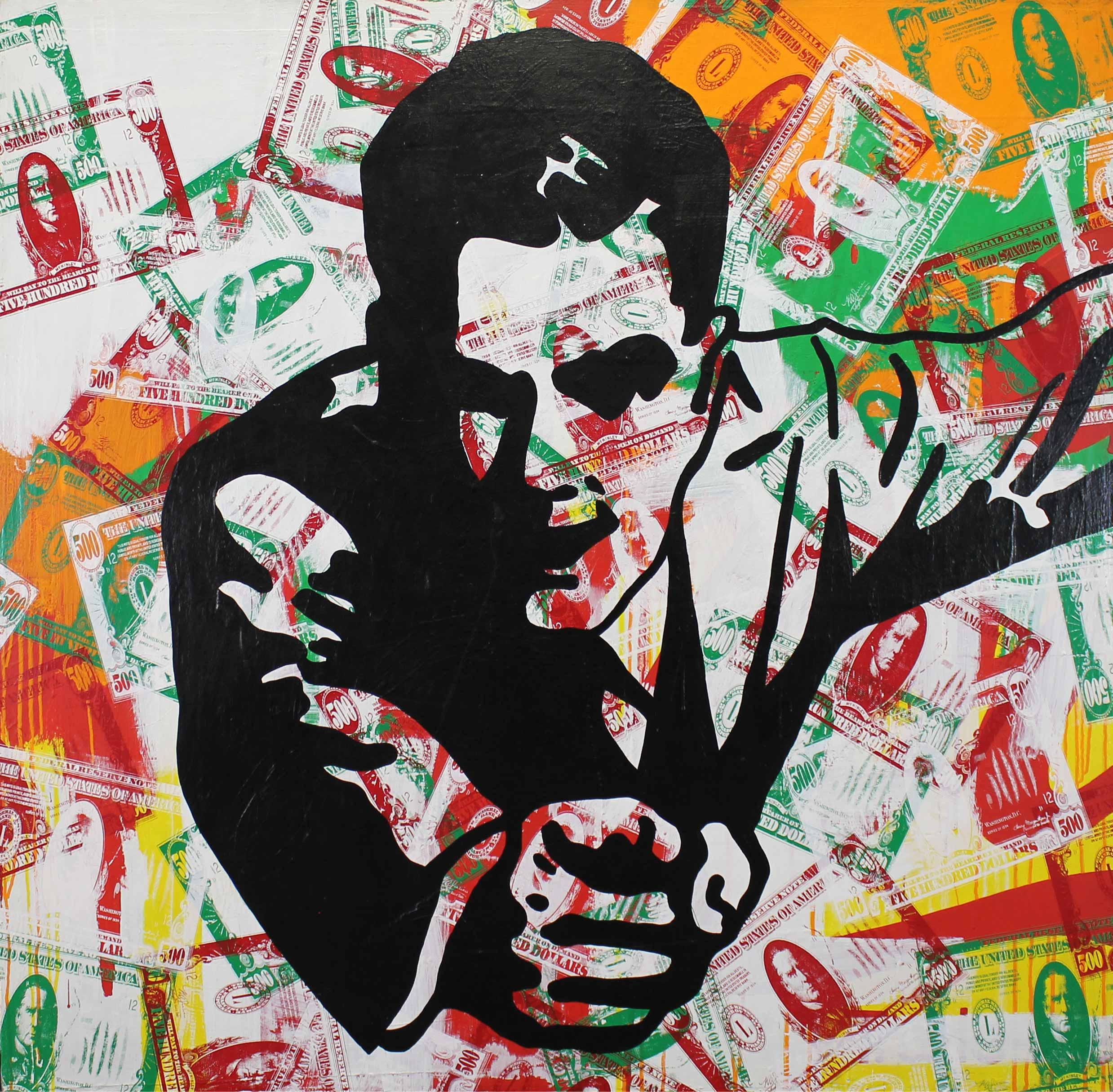 James Anthony, Buy It/ Too Buzy. Mixed media painting on canvas with silkscreen.