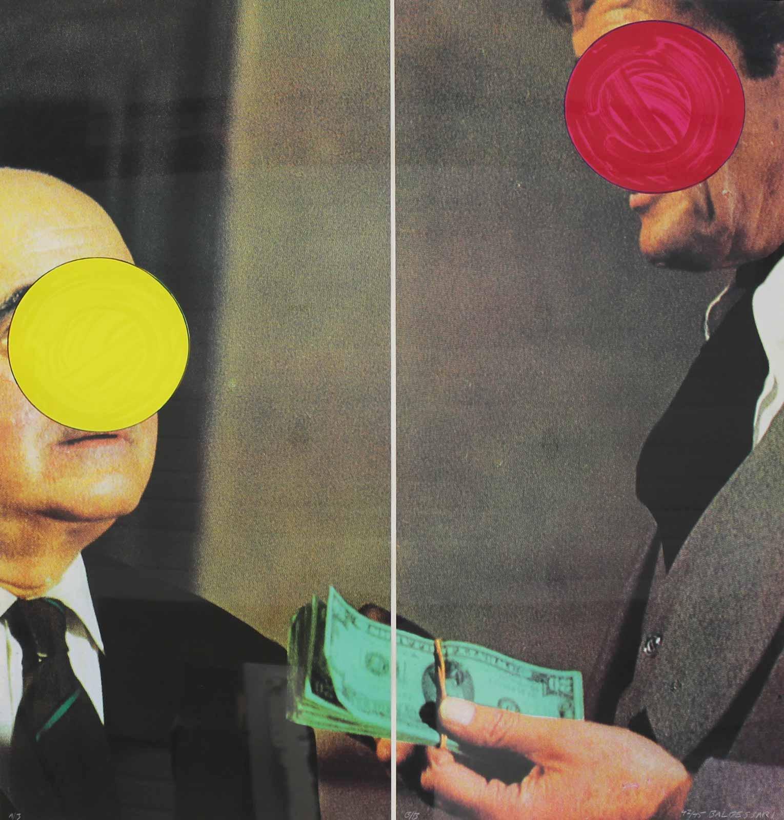 The late John Baldessari, like James Anthony, had a penchant for satire. Baldessari's Money with Space Between plays with the idea of creating a narrative through context imagery. The lithograph with silkscreen in two panels are composed of found imagery of two well-dressed men engaging in a transaction. Baldessari obscures the faces of these two men with his signature circle of paint; this invokes an insidious sense of suspicion for these men. Perhaps they are white-collar men engaging in white collar crime? The question posed leaves room for the viewer's own investigation.