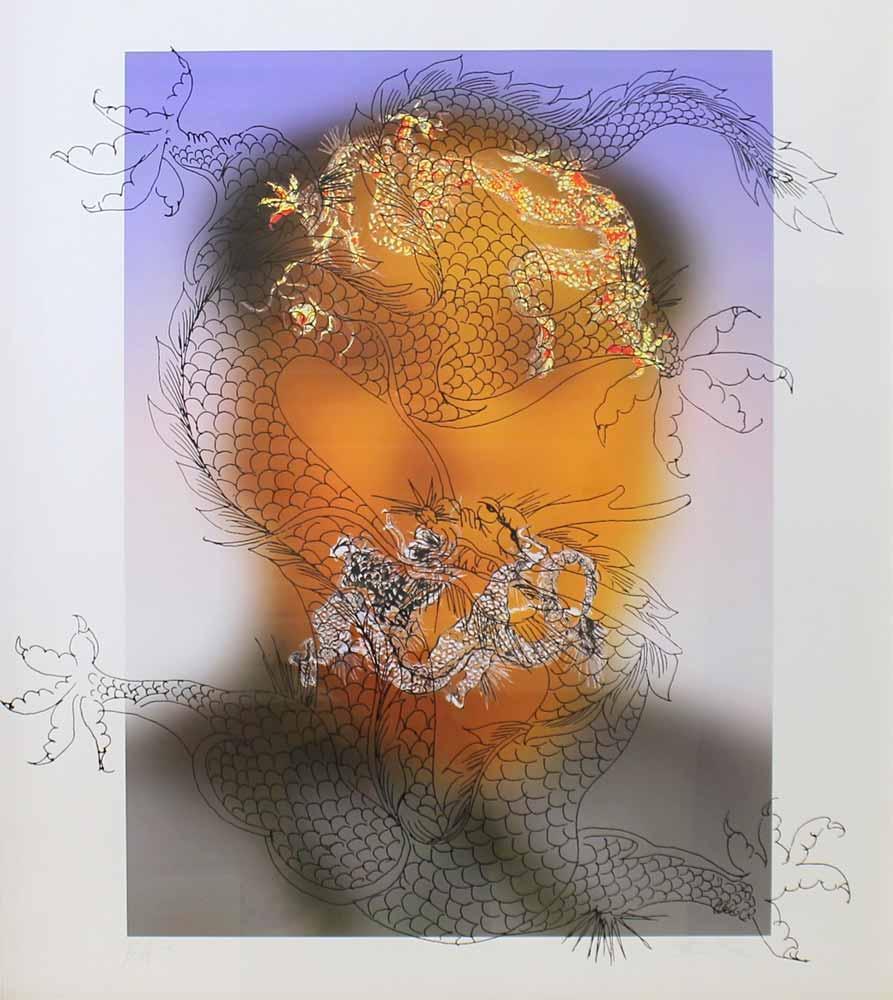 Considerations of Mao's notorious disdain of capitalism and his struggle to maintain his ideal of a “Red” society during the last years of his life is evoked in Mao with Dragon. While his image is symbolically blurred, the viewer is made to question whether his long-standing influence is at the foundation of the future society, or if instead that influence is fading away.