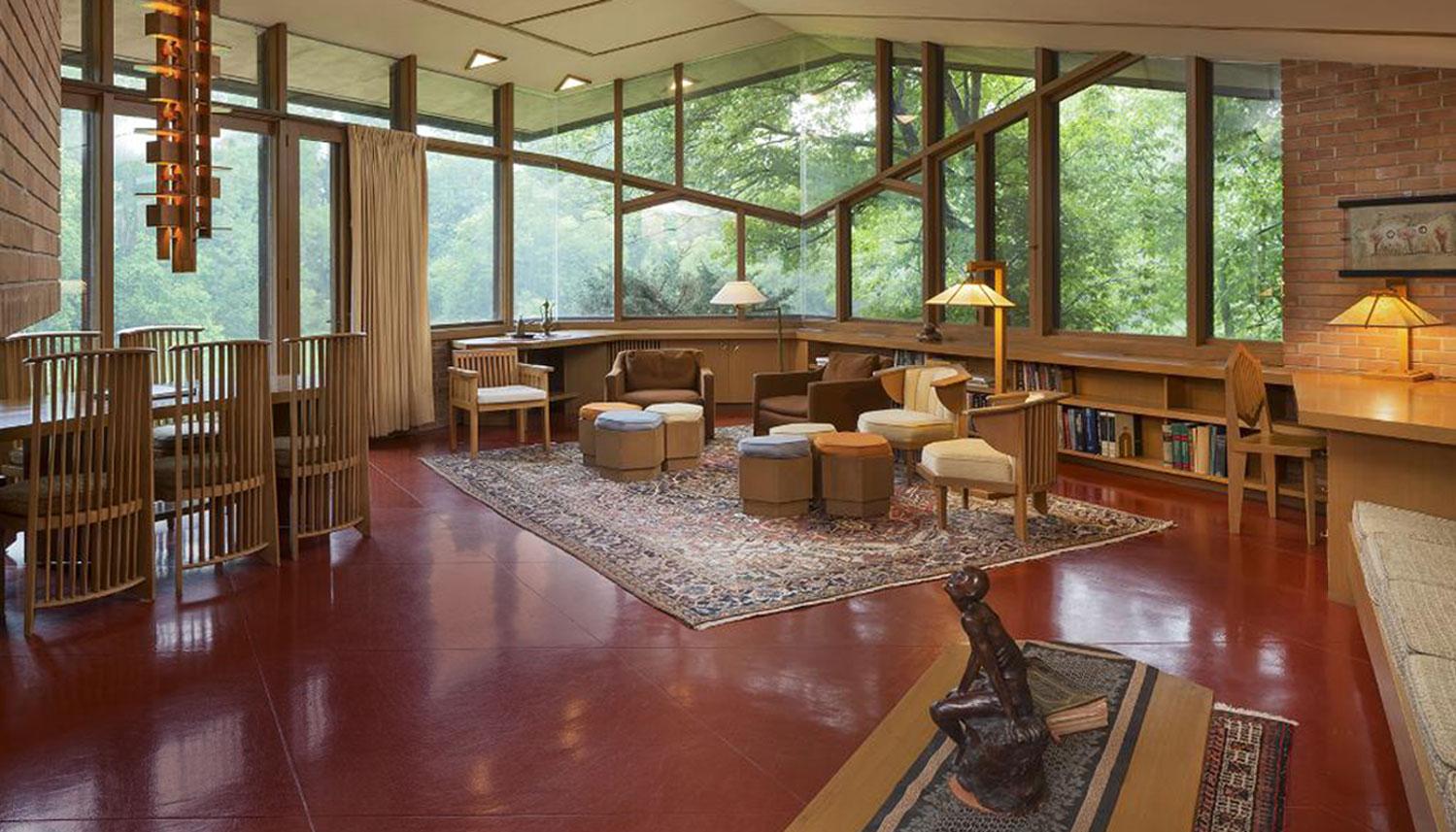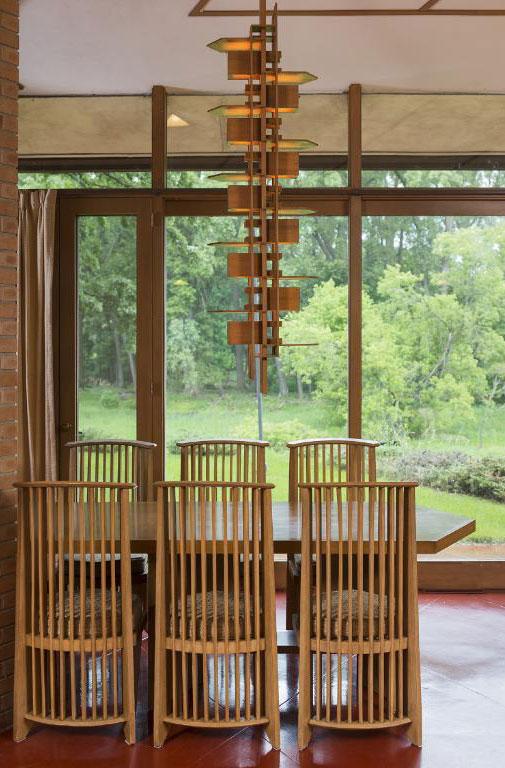 In signature Wright style, the uncluttered residence features both built-in and freestanding furnishings that contribute to the artistic unity of the home.