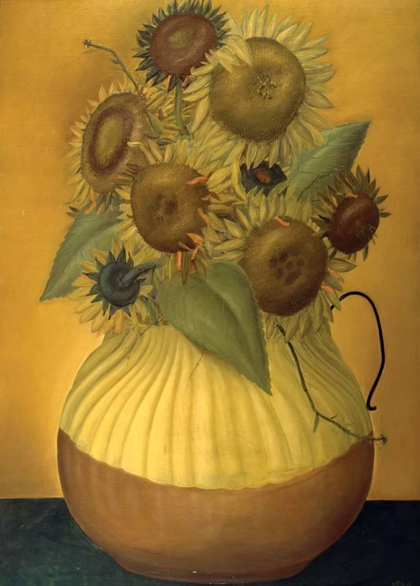 Botero’s “Girasoles After van Gogh,” is painted in oil on canvas and measures 98 x 71 inches, or 248.9 x180.3 centimeters.
