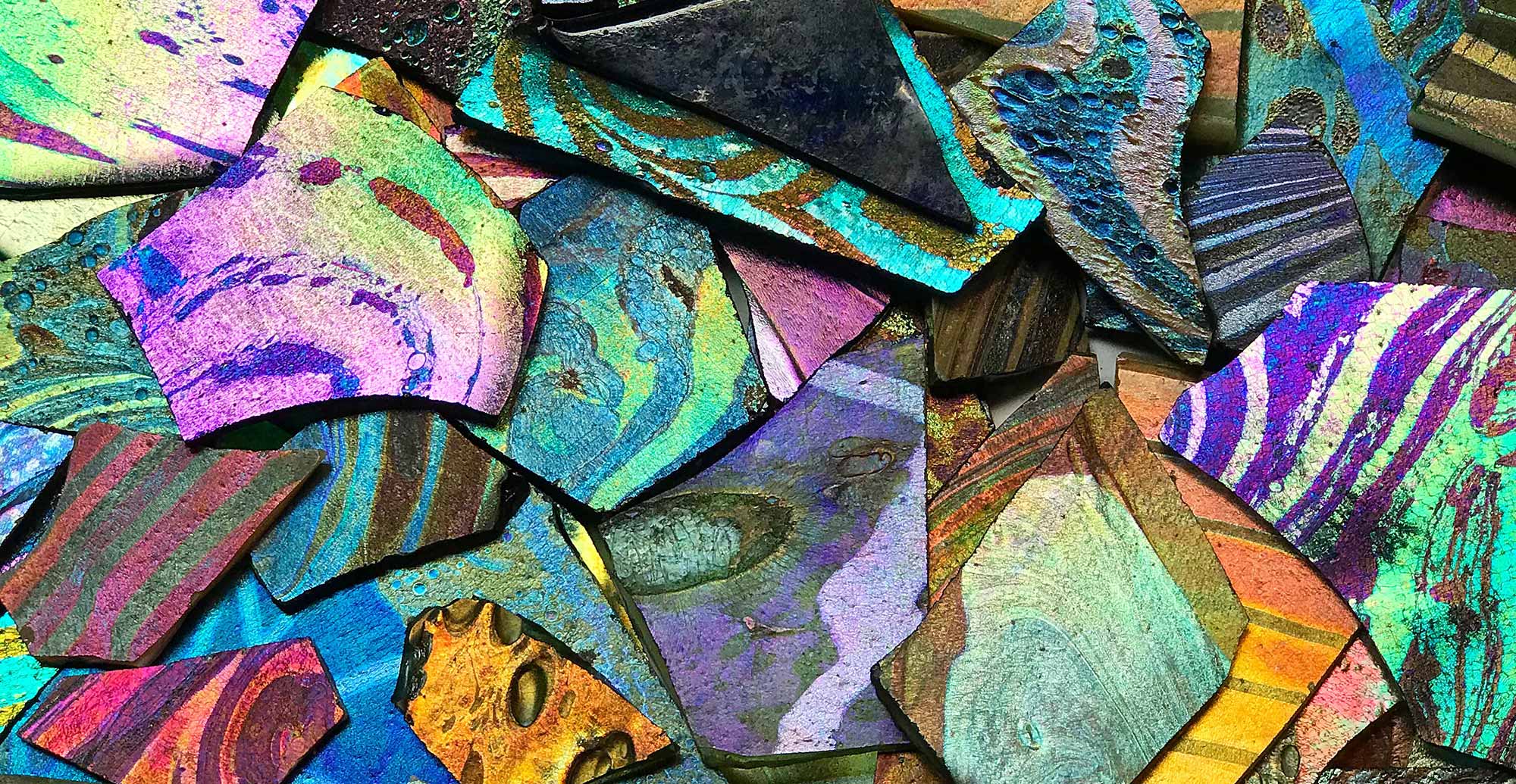 Ancient Roman and Syrian glassware seems to change color in shifting light, with a rainbow of hues rippling across its surface. This iridescence was not part of the original design, but after centuries buried in the earth, the glass was weathered into thin layers. The interaction of light through this decayed surface causes a kaleidoscopic effect similar to an oil slick, soap bubble, or a butterfly’s wing.