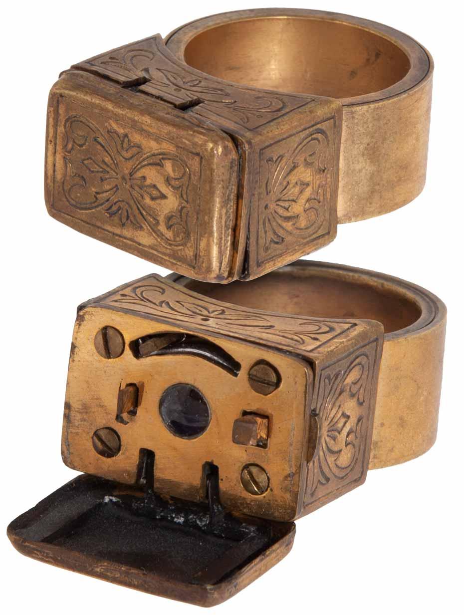 All three items can be found within a vast collection of spy relics that does actually read like a list of Bond gadgets, including all manner of code machines and surreptitious recording devices, which, until recently, formed the nucleus of New York City’s KGB Espionage Museum. The gold-plated ring camera, measuring 1 3/8” by 1½” and containing only enough film for one discrete snapshot, is particularly rare.
