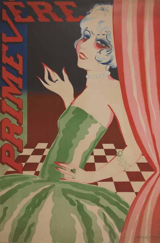 Magritte showed his early work—initially created in the style of the Impressionists before morphing into a blend of Cubism and Futurism—in local salon presentations and avant-garde publications. The artist’s first means of survival, however, came not from his personal paintings and drawings but from design work drawing decorative objects for wallpapers and through commissions for advertisements and catalogs. Designing posters and brochures for chocolate makers, car manufacturers, fashion houses, music publishers, and the cinema and theatre, Magritte was able to explore media and aesthetic styles, while sustaining a living and developing his painting skills and ideas on the side.
