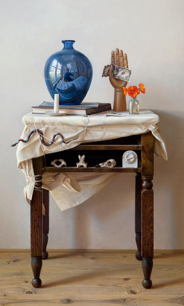 Yet, without a doubt, he is. Fraser's mastery of lifelike detail is such that one might be tempted to take a fingernail to a piece of tape on a painting, for example, to see whether the tape is real or rendered in oil.