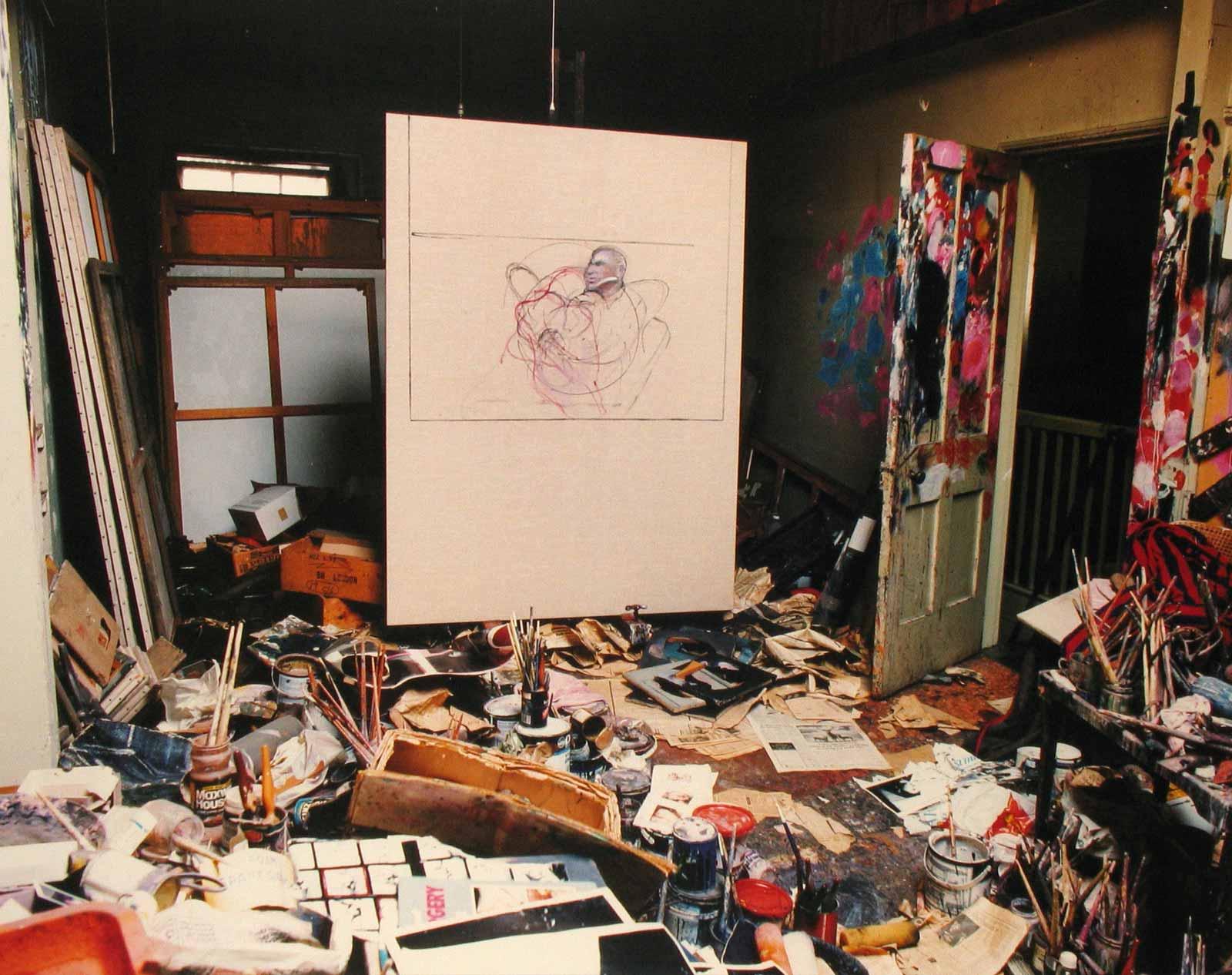 Bacon worked in the studio, which had once been the hayloft of a stable for a coach house, but he never organized it—instead it evolved around him. He used the door and walls to mix his colors and left trails of paint across the ceiling when throwing it on his canvases. When working, he positioned himself under the skylight with his painting supplies to his right, photographic source materials on the floor to his left, and the easel in front of him. While painting, he faced a round pitted mirror, which made the space seem larger and afforded a reflected image of the artist at work—his only studio companion.