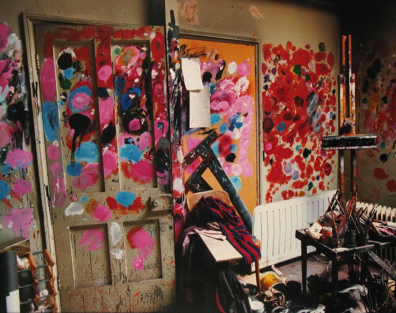 "I've been here for years—about twenty-three or more," Bacon told ITV's The South Bank Show host Melvyn Bragg, when he visited the studio in 1985. "It's kind of a dump that nobody else would want, but I can work here. These are a few of my abstract pictures here [pointing to the splotches of paint on the door and surrounding walls] because I use the walls and things to test the colors out on. I've tried to clean it up, but I work much better in chaos. I couldn't work if it was a beautifully tidy studio. It would be absolutely impossible for me. Chaos, for me, breeds images."