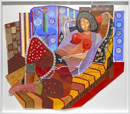 David Richard Gallery is pleased to present a solo exhibition of paintings and collages by artist Dee Shapiro. The presentation debuts Shapiro’s newest body of work, her first-ever figurative paintings that examine female nudes in art history, but through the artist’s unique lens of patterns and feminist discourse. Also included are earlier geometric paintings from the 1980s of antique Persian rugs that provide both cultural and historical context for the women figures as well as connecting the figures to Shapiro’s love of patterns, textiles, and sewing that influenced her career and work for five decades. The inclusion of the artist’s exquisitely detailed paintings on paper of male and female genitalia shift the attention away from objectifying and essentializing the female body to more of a focus on playful and decorative depictions of genitalia as the functional and organic structures they are, with, of course, a dose of innuendo. Collectively, these three bodies of work not only span and define Shapiro’s long and thoughtful approach to art-making but provide a cultural context for reconsidering the female body through art. By appropriating and reconsidering female nudes from art history and recontextualizing and re-presenting her own artworks, Shapiro has Snatched and Reworked both hers and the work of others into a masterful and historical feminist discussion.