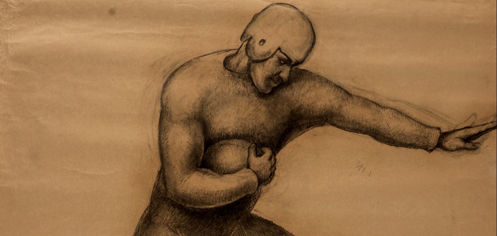 Like many team sports in Western Europe and North America, American football first emerged as a game for upper-class young white men. Professional football dates to 1892, when the first college players began receiving financial compensation for play. Despite its relative paucity in the art world compared to other sports, artists have long been compelled by football’s contentious history, rules, players, and the fervent culture of fandom it has inspired throughout the United States. The game remains a uniquely American past-time—playing it, watching it, and identifying with its teams and athletes. And the relatively few artists who have explored it since its inception have been drawn to the cultural issues that accompany it: the beauty of the male athletic body in motion, celebrity culture, the physical duress and damage the game can cause, the passion it inspires in fans, and ever-present questions about sexism, racism, inclusion, exclusion, exploitation, and commercialism.