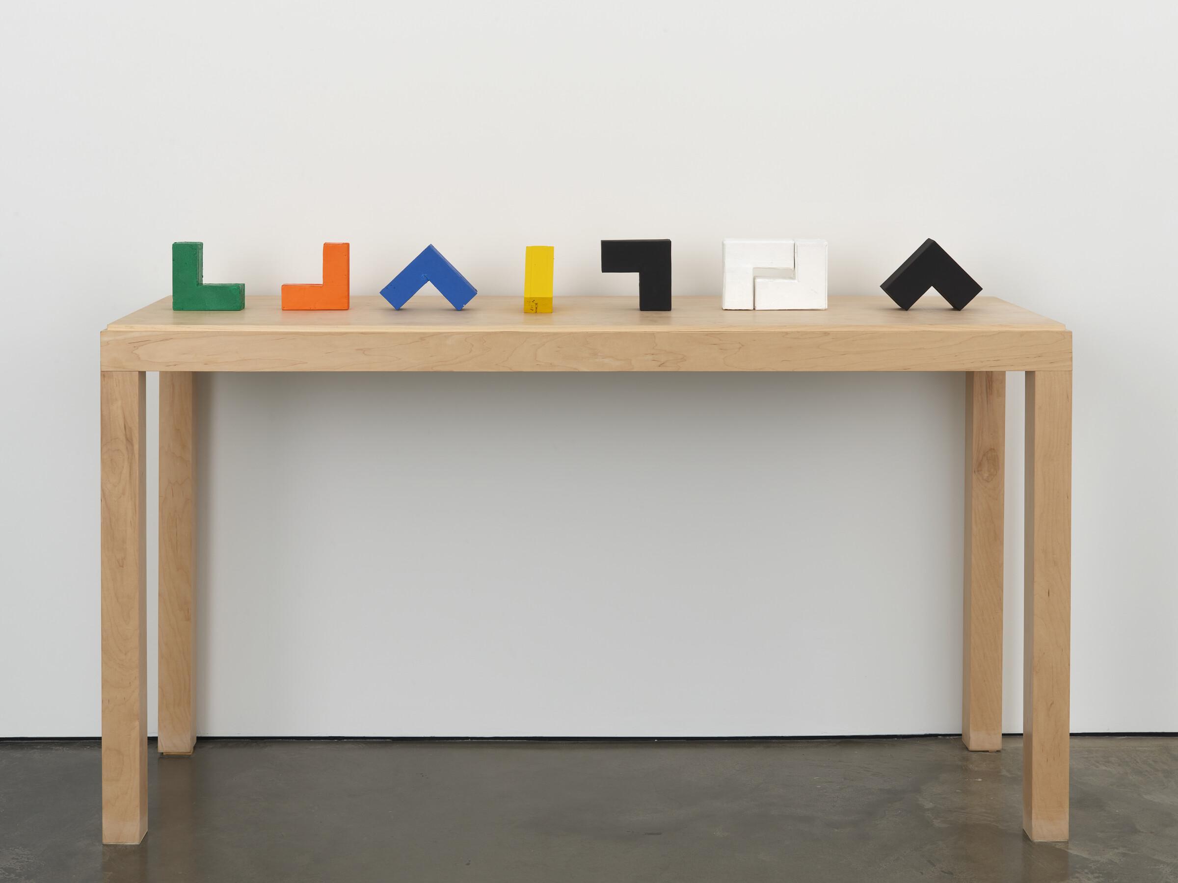 The results are truly marvelous. Herrera’s sculptures range from seven to twelve feet in size, and practically vibrate under their pure, intense coats of color. Walking around each inventive work uncovers an infinity of dynamic angles and views. All sculptures have a historic date marking when they were conceived on paper in the 1960s and 1970s, and a fabrication date. Though most of the streamlined, colorful sculptures emit a sense of joy, Pavanne (1967/2017)–an interlocking, ultramarine block that stretches nine by nine feet–is a solemn memorial to Herrera’s brother, who was dying of cancer at the time she composed it. Herrera injects an unexpected depth of emotion into her sleek, geometric forms.