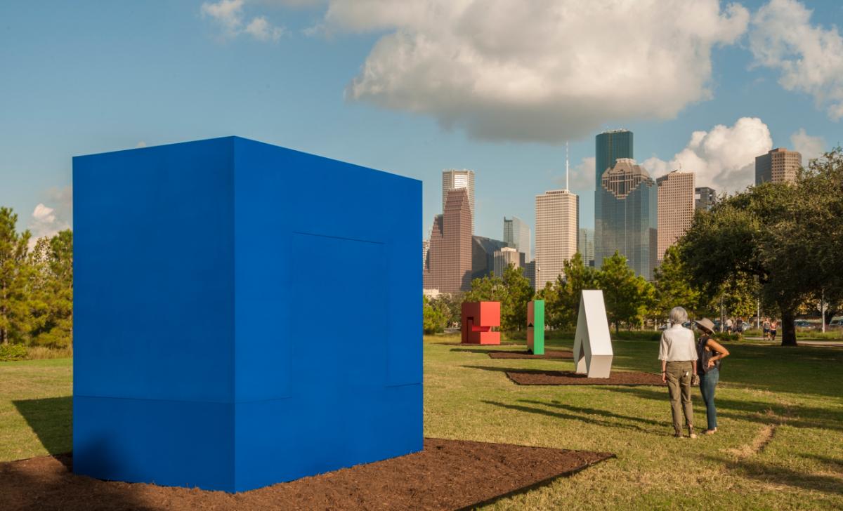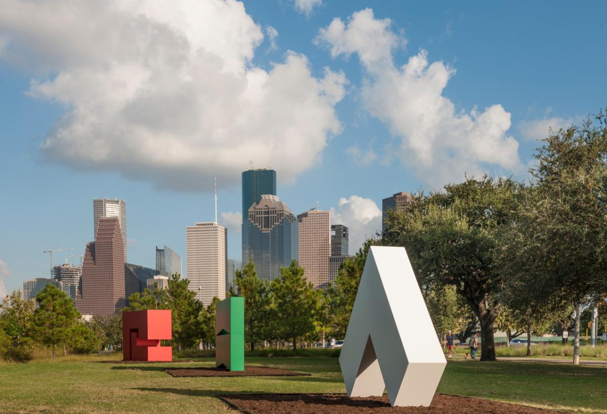Co-organized by Houston’s Buffalo Bayou Partnership and New York’s Public Art Fund (PAF), Carmen Herrera: Estructuras Monumentales features four of the artist’s new monumental sculptures. This is Herrera’s first public art exhibition in Texas, and only the second time that these large-scale works have been presented: an initial display took place at New York’s City Hall Park in 2019. A concurrent exhibition, Carmen Herrera: Structuring Surfaces at the Museum of Fine Arts Houston (MFAH), showcases more than thirty works from the 1960s to present, including paintings, drawings, prints, wall structures, and objects that served as models for the new sculptures. Together, the two exhibitions offer a rare glimpse into the decades-long story behind Herrera’s move from two to three dimensions, a journey fueled by the artist’s determination and clarity of vision.