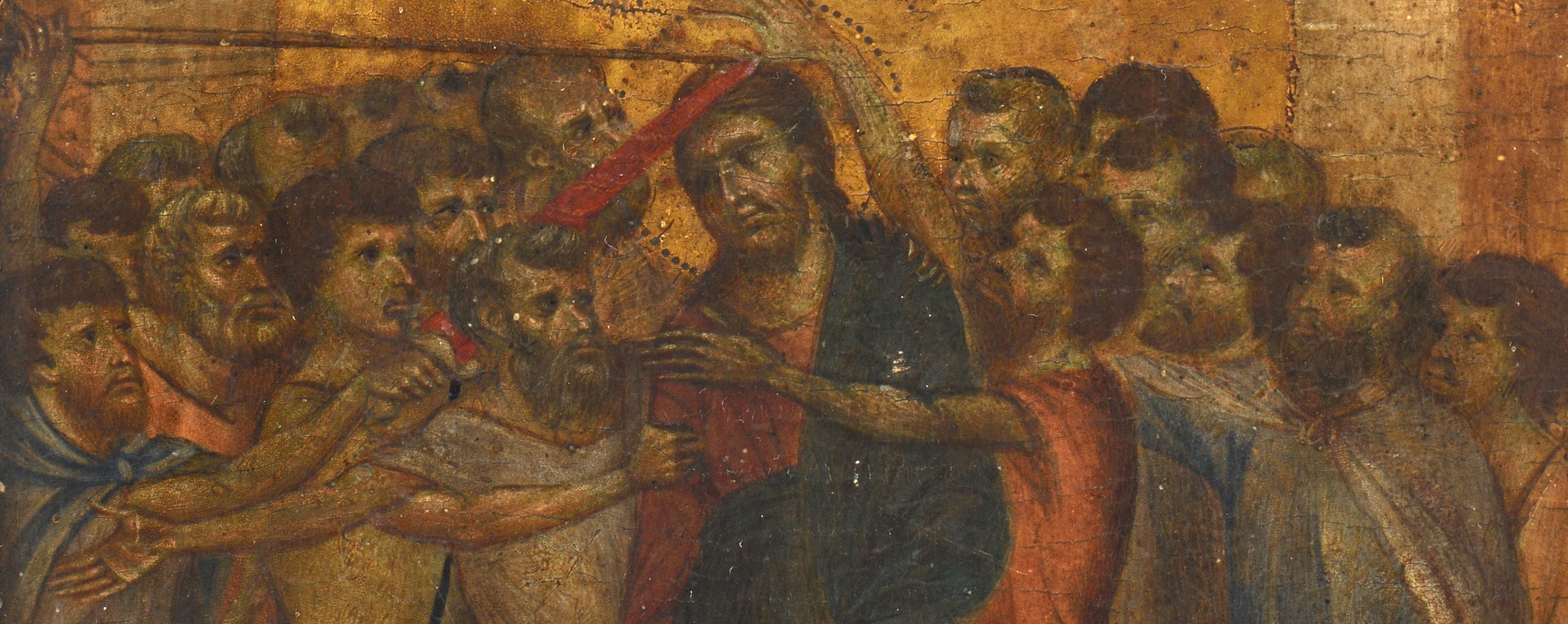 Scholars believe the piece is part of a polyptych (a painting that consists of three or more panels) depicting the passion of Christ. Other works in the same series, created in 1280, include The Virgin and Child Enthroned with Two Angels, held by the National Gallery in London, and The Flagellation of Christ, held by the Frick Collection. Painted in egg tempera with gold leaf on a poplar panel, it is believed that it originally would have had a red border, like the other works in the series.