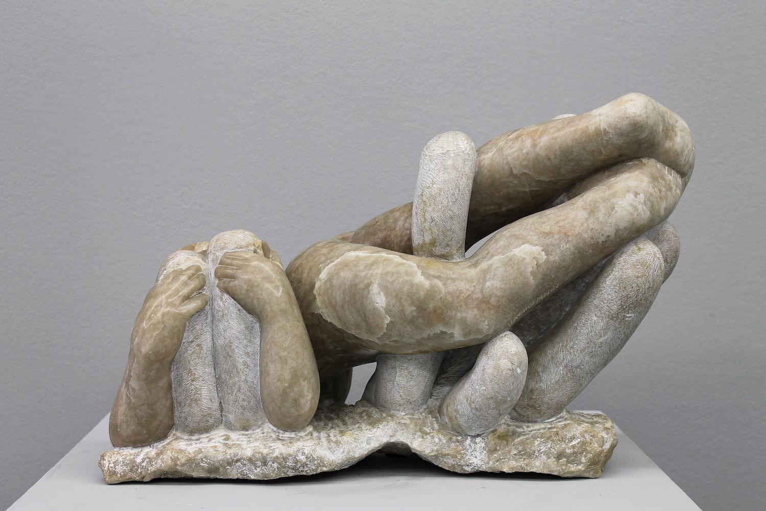 The surrealist influence is inescapable in the extraordinary sculptures of Kay Hoffman and Nancy Youdelman. Hoffman shares a selection of figurative alabaster pieces, in which female bodies are caught canoodling with and cuddled by abstract, organic forms, while Youdelman presents a fanciful plant-like structure in her 2019 assemblage Silent Tower, which incorporates kitchen utensils and pearl necklaces. Likewise, Catalina Ouyang’s 2020 sculpture font III offers a curious combination of soapstone, kombucha mother, horse hair, raw egg, and glue to fabricate a bizarre form of birth on the gallery’s floor.