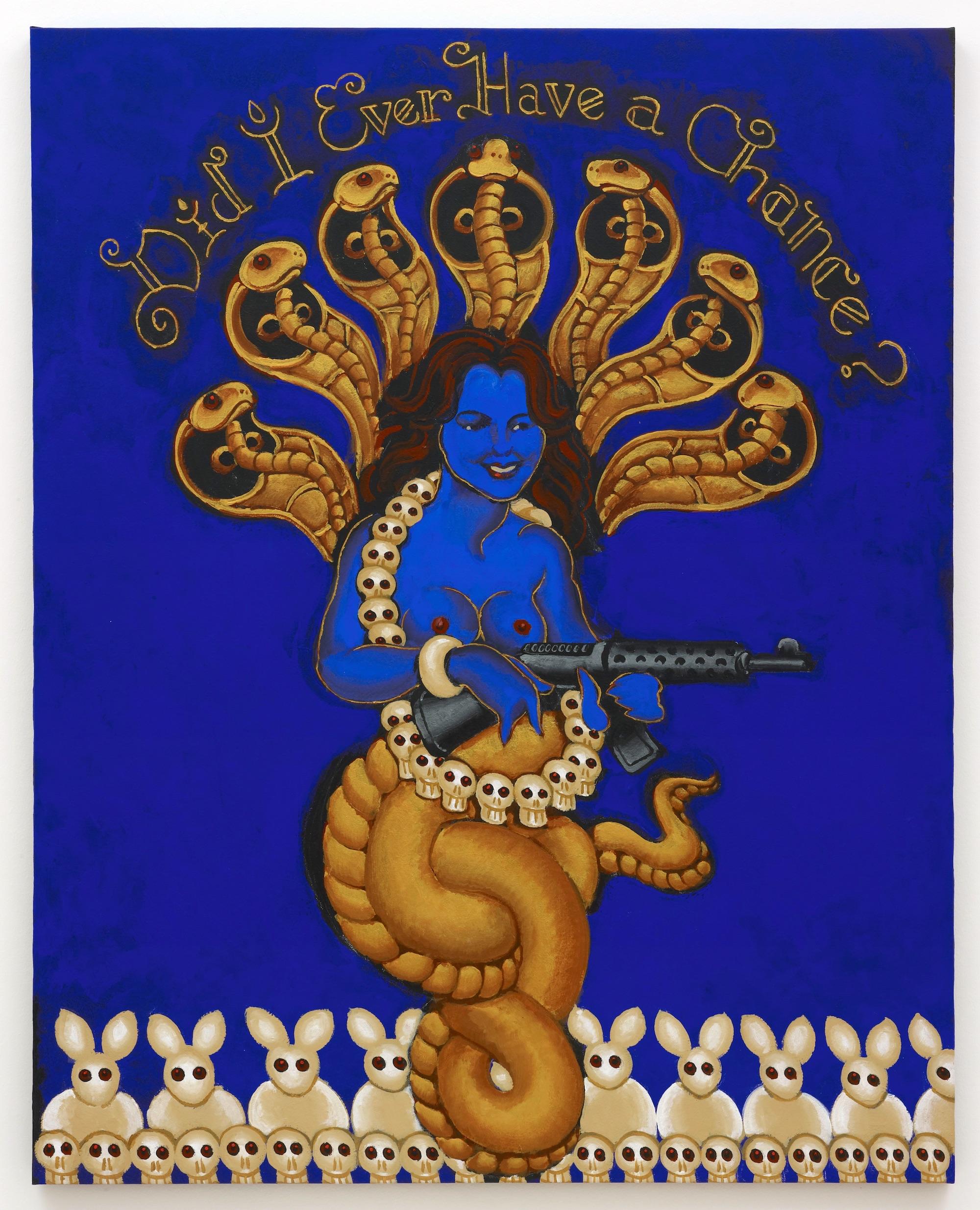 As powerfully as language is utilized in this show—alongside additional visually potent pieces by Lorraine O’Grady and Martha Rosler—it’s hard to top the final work of art created by Martin Wong, a 1999 painting that lends its title to the overall exhibition. Portraying a gun-toting Patty Hearst as Kali, the Hindu goddess of death, with the decree “Did I Ever Have a Chance?” written above her and rows of dead rabbits below, it was defiantly painted by the artist in his hospital bed as he was dying from complications related to AIDS.