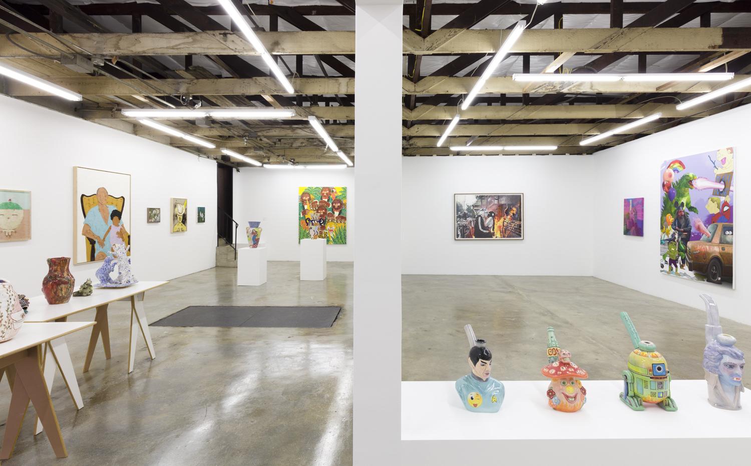 Things get even crazier in Devin Troy Strother’s paintings of cartoon characters with psychedelically expanded minds and death pillaging in the name of funk and John de Fazio’s glazed ceramic bongs of Elvis as a vampire, Spock with a smiley face emoji on his uniform shirt, and R2D2 bursting into flames. But the artist collective FriendsWithYou restore a level of tranquility to the mix in their peaceful portrayals of spirit animals, compellingly rendered in an Impressionistic style of painting with colorized Plastiline clay in wooden frames.