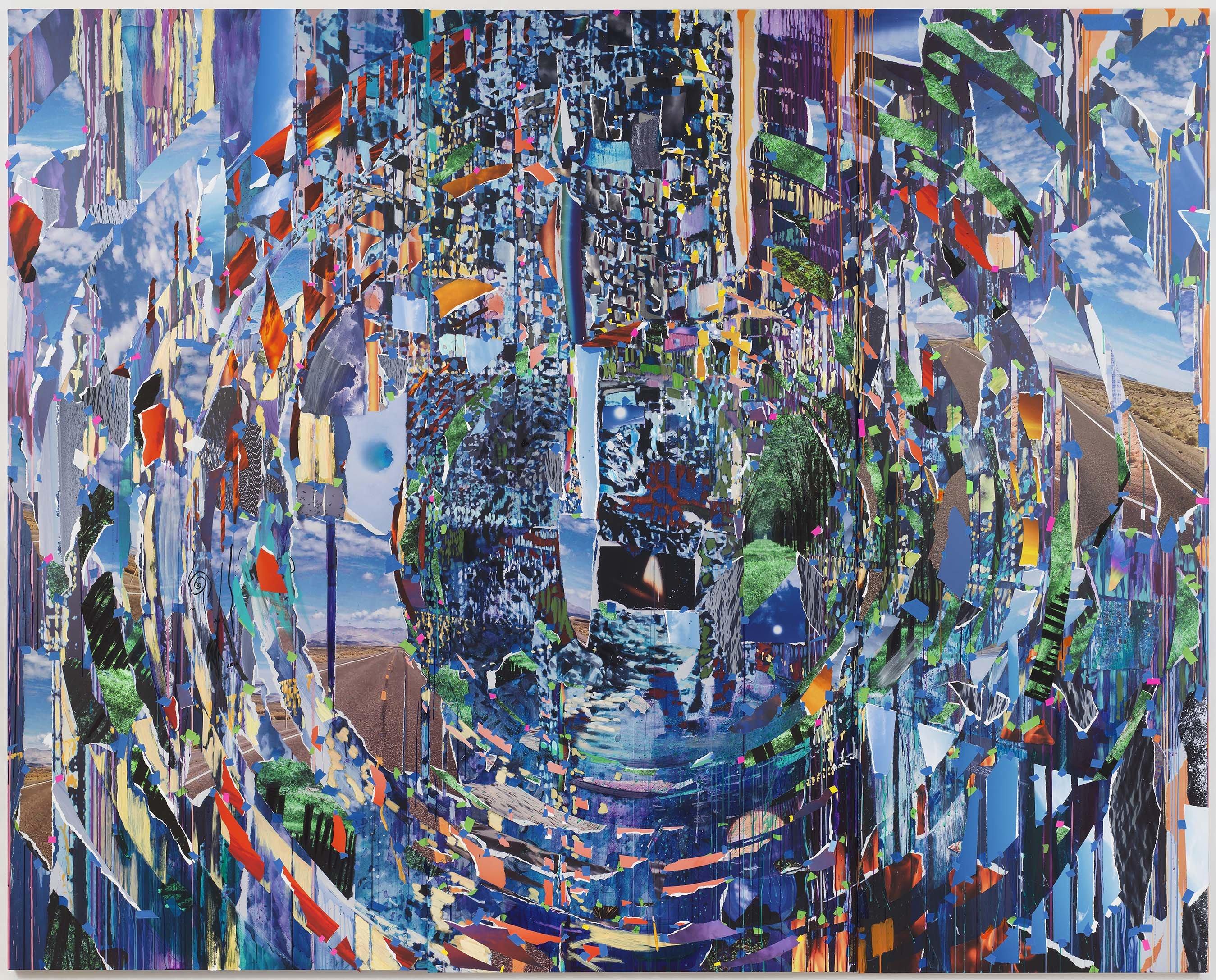Visitors to the Paris show are greeted by the multimedia installation Plein Air (Times Zero). In a darkened gallery, bits of imagery are assembled on a network of metal rods, where drifting shapes of projected pictures connect and overlap during a looping orbit. The layered paintings in the rooms that follow energetically flatten the projected imagery into collapsed collaged canvases.