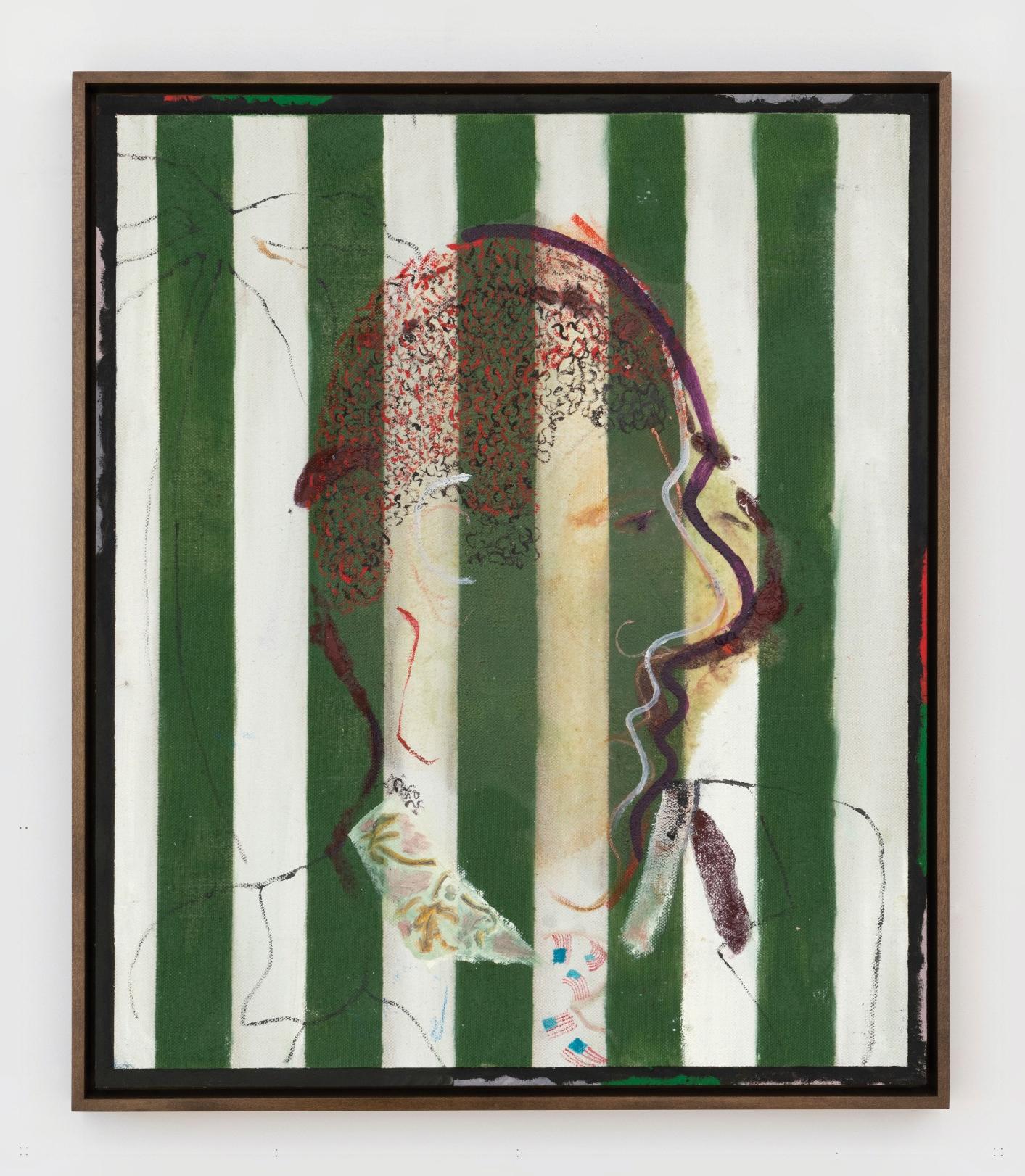 The Painting Lesson takes a canvas from the period of his second solo with Grimm, which dealt with the relationship between free will and fate, as a jumping-off point. Revealing elements of that show’s signature checkerboard motif in the eyes, nose, and prominent punctuation mark that were cut from another canvas, the work elucidates the artist’s intuitive yet deliberate process of creating his paintings.