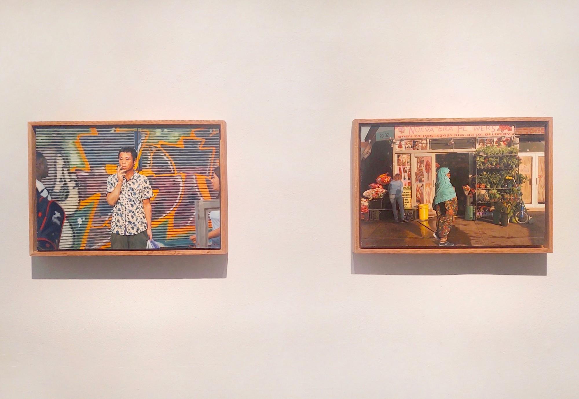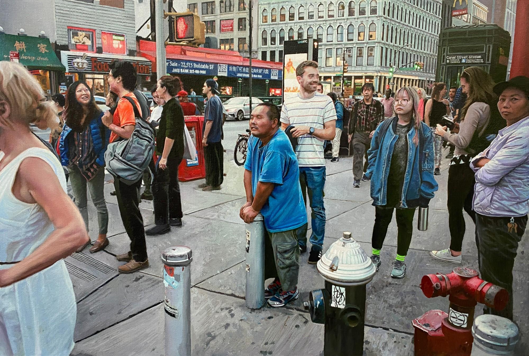 Inspired by the street photography of Philip-Lorca diCorcia, who dramatically documented New Yorkers moving through crosswalks and lingering on sidewalks, Ozeri captures everyday people in motion on the city’s bustling thoroughfares. Chinatown is a favorite subject, with crowds gathered on Canal Street and homeless men lying on the sidewalk and sleeping in cardboard boxes, while in the subway people are seen waiting on platforms and staring into space when in transit on the trains. Contrastingly, his colorful paintings of Tel Aviv show shoppers in the open air markets and young people traveling on electric scooters—looking as though they didn’t have a care in the world, which may be how the artist recalls his youthful days there.