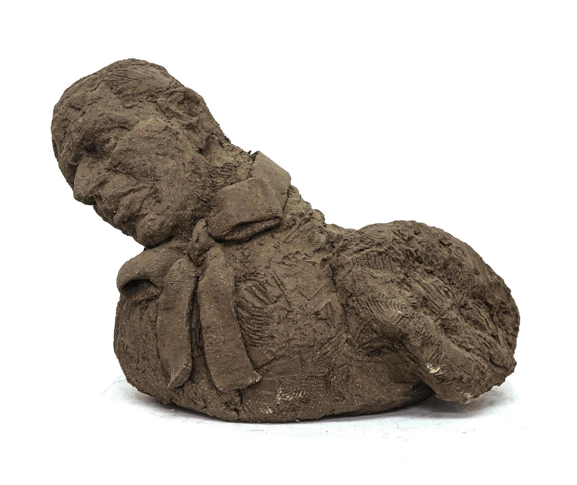 “It’s the clay itself that suggests the forms,” she said in a 2011 interview with the Block Island Times. “It becomes a dialogue between me and the clay.” And that dialogue is evident in two pieces titled Creole—one that depicts a duck with a bow around its neck and the other with an identical body that surreally possesses the head of an aged man—and in the untitled clay composite of a woman’s head on the body of a dog. Some of the quirkier assemblages in the show include Grandmother, which has the clay head of a woman on a doll’s body in a toy baby stroller; a doll’s head and torso attached to the lower half of a child’s body formed from clay; and a pair of clay boots with bicycle handlebars stuck in them and a dismembered clay head of a man strangely squeezed between the bars—pieces that let you know you’re not in Kansas anymore.