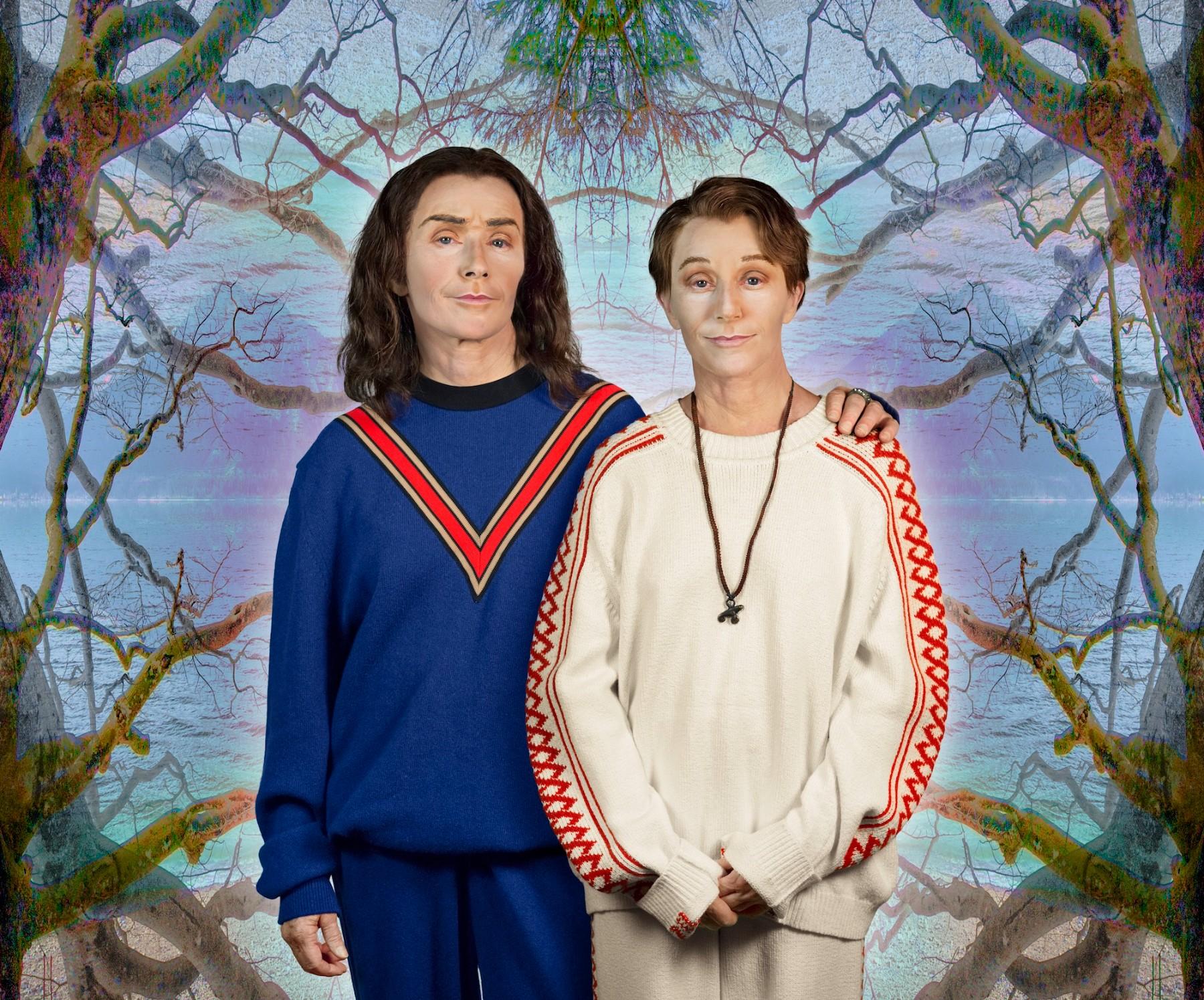 In the painting-size picture Untitled #602, Sherman assumes the role of a preppy, scholarly chap wearing an overcoat, pants, and T-shirt with a Cindy Sherman photo printed on it as he pensively stands at the fork of a garden path. In another image, Untitled #615, she sits on a stool dressed like a soldier in a khaki shirt and cowboy patterned outfit while her bodily image digitally reverberates in front of an equally surreal, mountainous scene. And in Untitled #618, Sherman plays a nerdy androgynous couple who suspiciously confront the camera in a lakeside setting that looks like it’s straight out of a Hitchcock film—causing one to reflect on the spectacular, cinematic mood of all of the artist’s work.