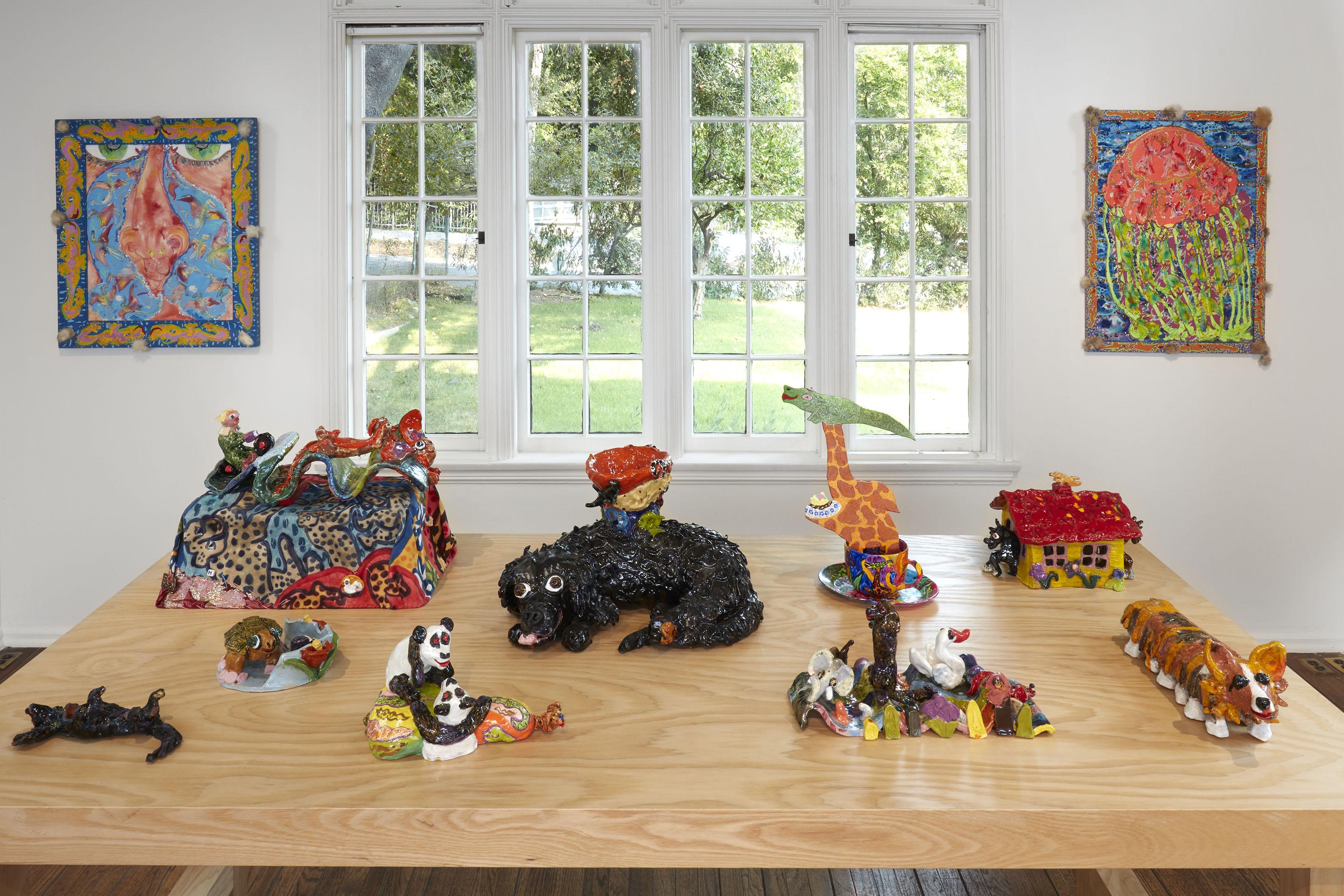 Equally as funky—or, in Peeples-Bright case, nutty—are the artist’s quirky ceramic sculptures. Standout pieces from the ‘00s include Horse House with Red Roof, which comically depicts two horses leaving a house from opposite ends, and Corgi-Pede, that presents an elongated dog with multiple feet, while the more recent Rider on Rabbit Waves captures a cyclist on rolling seas full of bunnies. Wholly embracing the Nut Art manifesto of making witty works, which are also phantasmagorical, Peeples-Bright continues to represent a movement that’s ripe for resurrection, particularly in these troubling times.