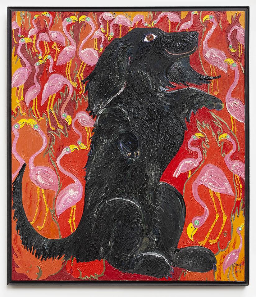 Presenting paintings, ceramic sculptures, and works on paper from 1964 to 2020, the exhibition beautiFOAL, which is her first solo show with the gallery, offers a lively overview of the 78-year-old artist’s enchanting practice. The 1969 painting Goose Lady Godiva, which is indicative of the colorful, naïve style of creativity that she has continued to pursue, portrays the nude noblewoman covered with illustrations of ducks and swans riding through a fairy tale realm. In the watercolors Pterodactyl Tears and Jackalope Jellyfish, from 1971 and 1972 respectively, she added glitter to adorn the ancient creatures and painted the frames with imagery of playful reptiles, while in the 1977 canvas Woof's Eternal Flamingo Flames she captures a begging dog surreally surrounded by flickering flames and pink flamingos.