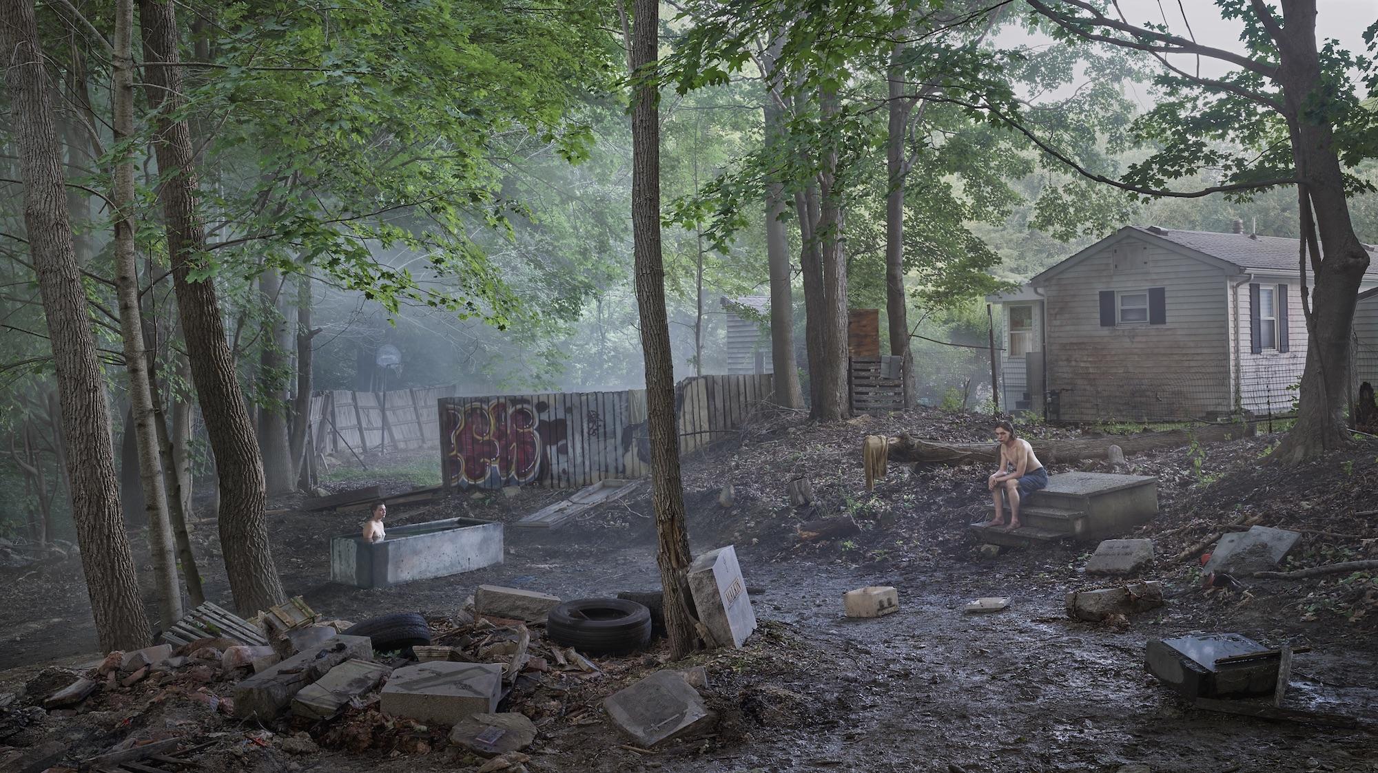 And in Funerary Back Lot, a young man sits on the steps of a house that’s no longer there, looking at a tombstone propped against a tree, while a woman who could be his wife or sister bathes in a large metal, water trough for farm animals. Constructing twilight tableaux that are as eerie as scenes straight out of David Lynch movies and as desolate as the subjects of Edward Hopper’s melodramatic canvases, Crewdson gives us a bird’s eye view of abandoned realms and the once-proud people who have been left to inhabit ruins.