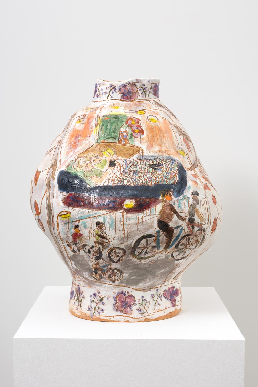 Trained as a painter, Jennifer Rochlin began working with clay in 2007 and now exclusively works with the medium. Best known for her hand-built, coiled vessels that are amorphously shaped and glazed with imagery that wraps around the surface of the clay, Rochlin creates figurative narratives that evoke memories and meaningful moments in her life. Installed on plinths to present an immersive environment, the artist’s charming ceramics offer a fresh outlook for the age-old art of storytelling.