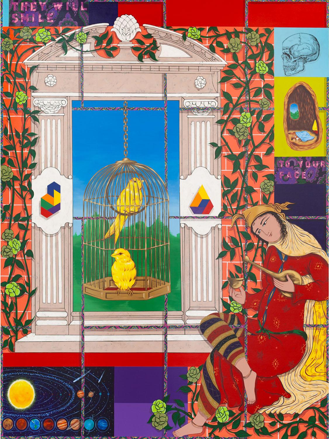 The painting Science Is The Antidote, Superstition Is The Disease is a puzzle-like piece that mixes Americana with Islamic mythology and an old map of the world, while They Will Smile To Your Face simulates the composition of an enlarged Persian miniature with imagery from science and art centered around a birdcage with one bird that is caged and another that’s free. Remember My Child, Nowhere Is Safe layers imagery of a maiden spilling wine and black and white hands holding a symbolic plant, placed in front of a floral rug that’s blocking a floor plan of a structure, which is sided by a picture of Columbus being greeted by Native Americans and an hourglass measuring time.