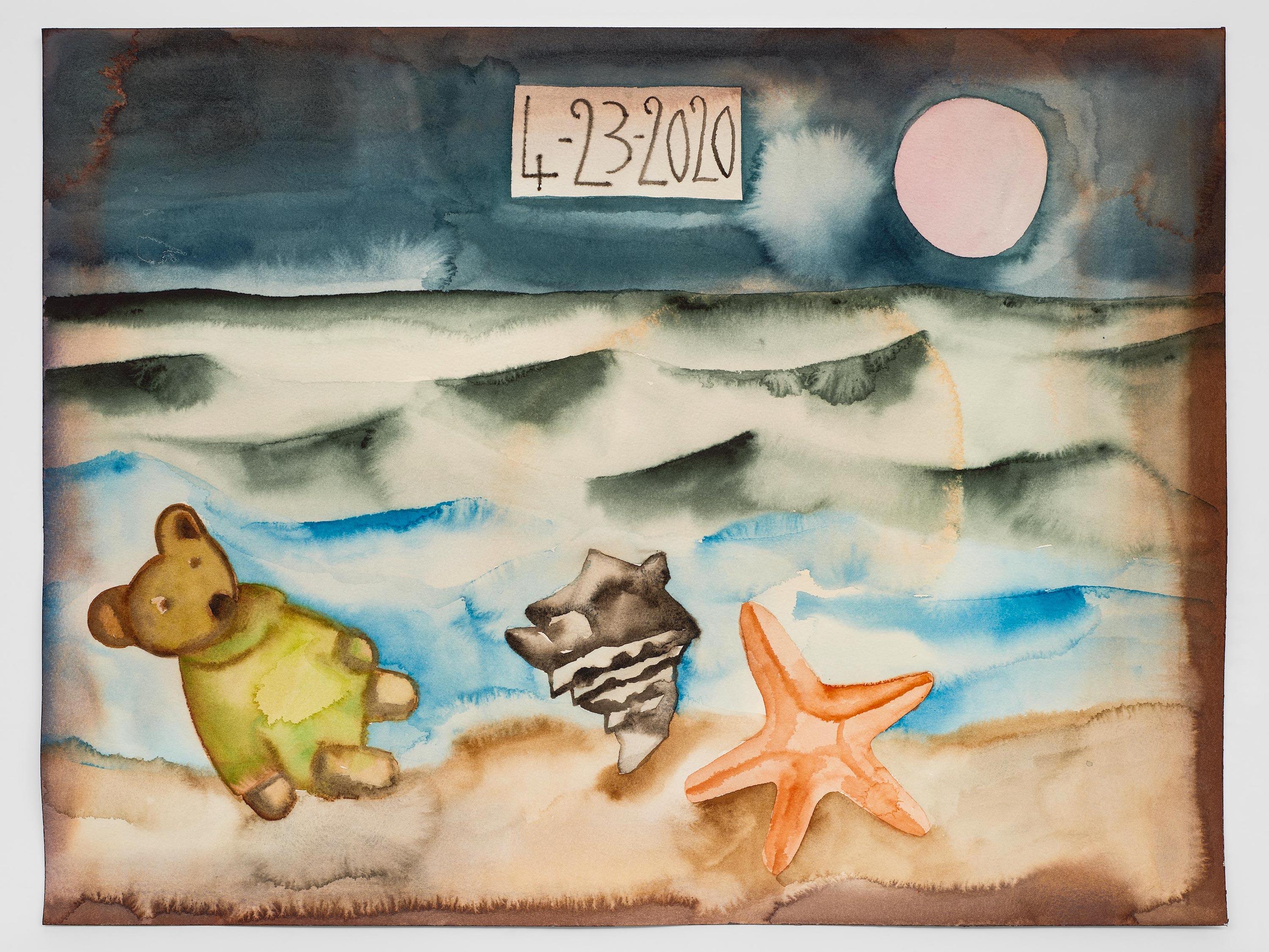 Pictured at the in-between space of the shoreline—a place that the artist says is “like twilight, a place where the line is blurred” in a video conversation with Raymond Foye, a writer, curator, and publisher, who co-founded Hanuman Books with Clemente in the late-80s—the saturated series of watercolors mark the passing days in lockdown in a dreamlike manner. Named for the day in April that each piece was painted, 4-10-20 depicts a lone conch shell on the beach; 4-12-2020 captures one shell in the water and another onshore; and 4-23-2020 pictures a teddy bear, shell, and starfish washed ashore on a moonlit night.