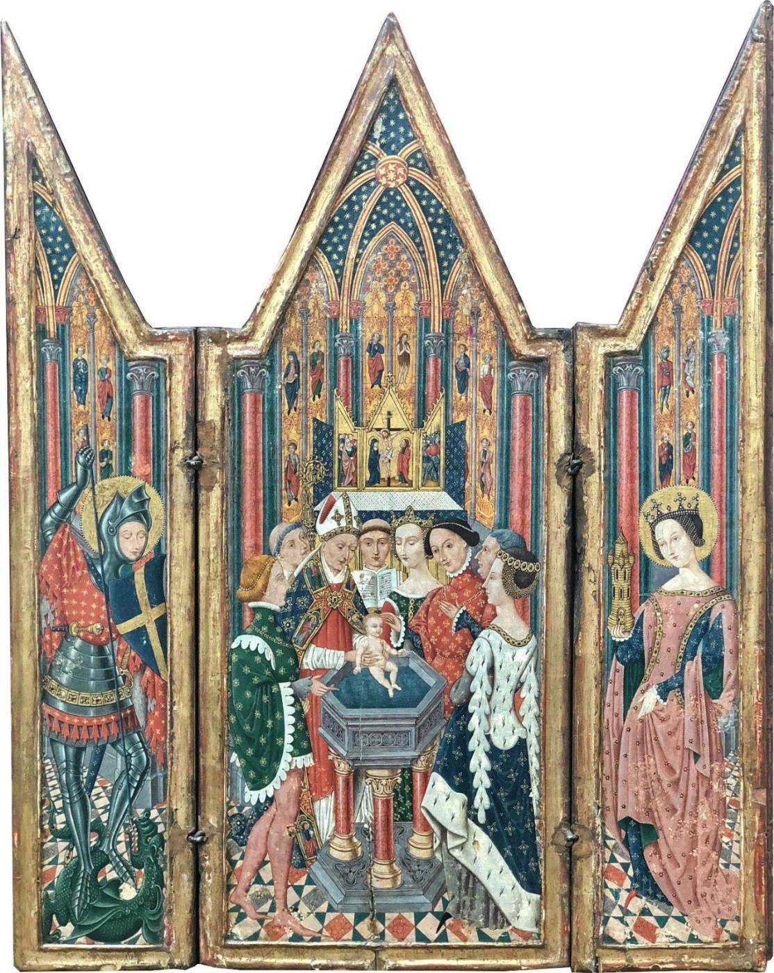 Spanish Forger, Triptych of a Baptism with Saints George and Barbara